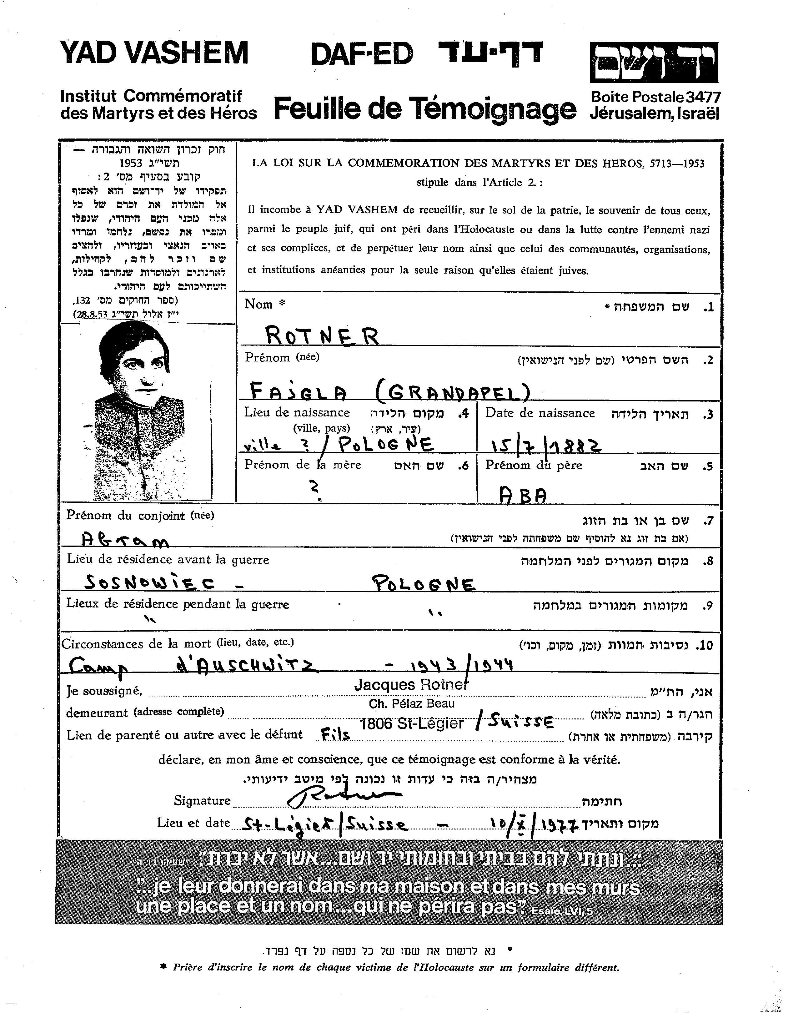 Fajgla Rotner, geb. Grandapel wurde im Jahr 1882 in Ville, Frankreich geboren. Vor dem Zweiten Weltkrieg lebte sie in Sosnowiec, Polen.