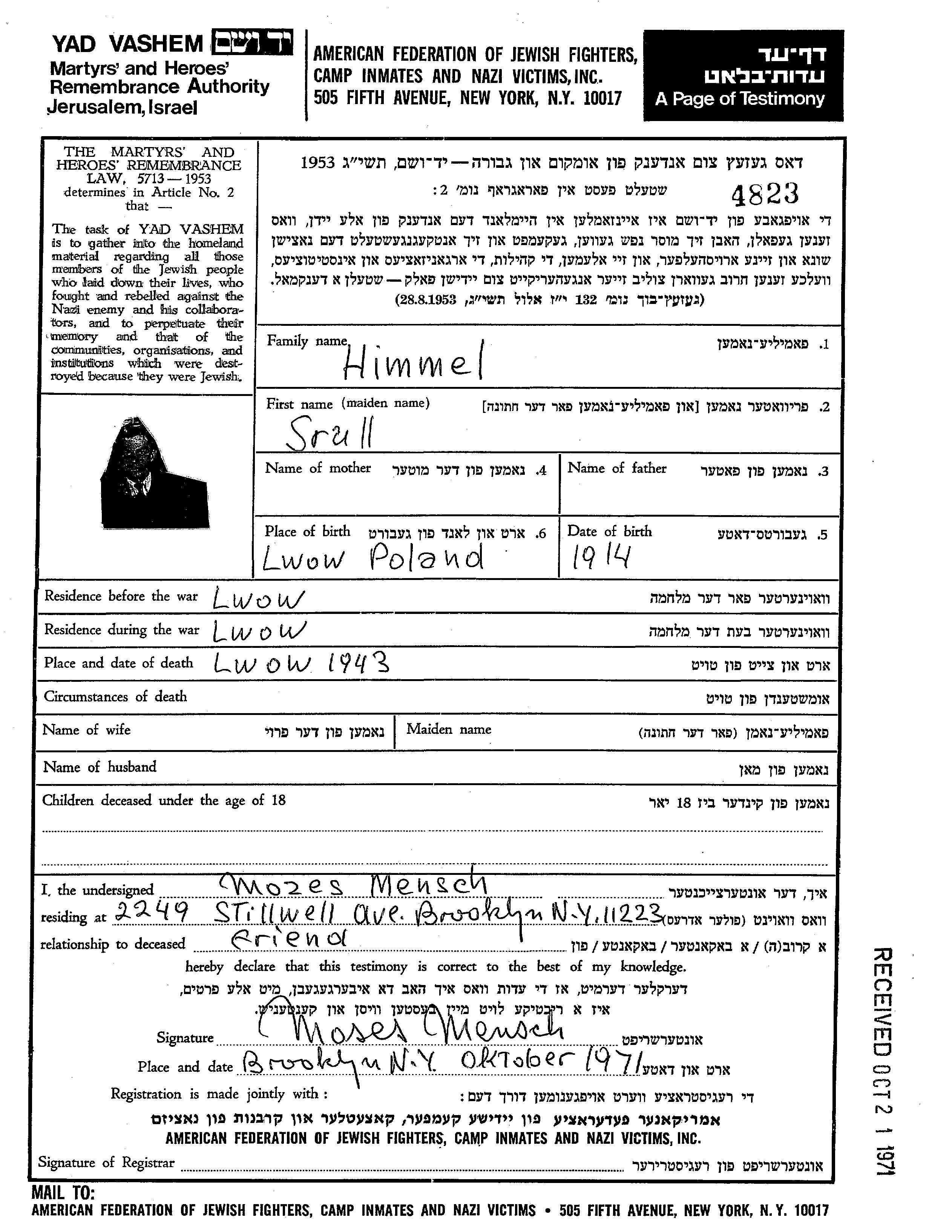 Srull Himmel wurde im Jahr 1914 in Lwow, Polen geboren. Vor dem Zweiten Weltkrieg lebte er in Lwow, Polen.