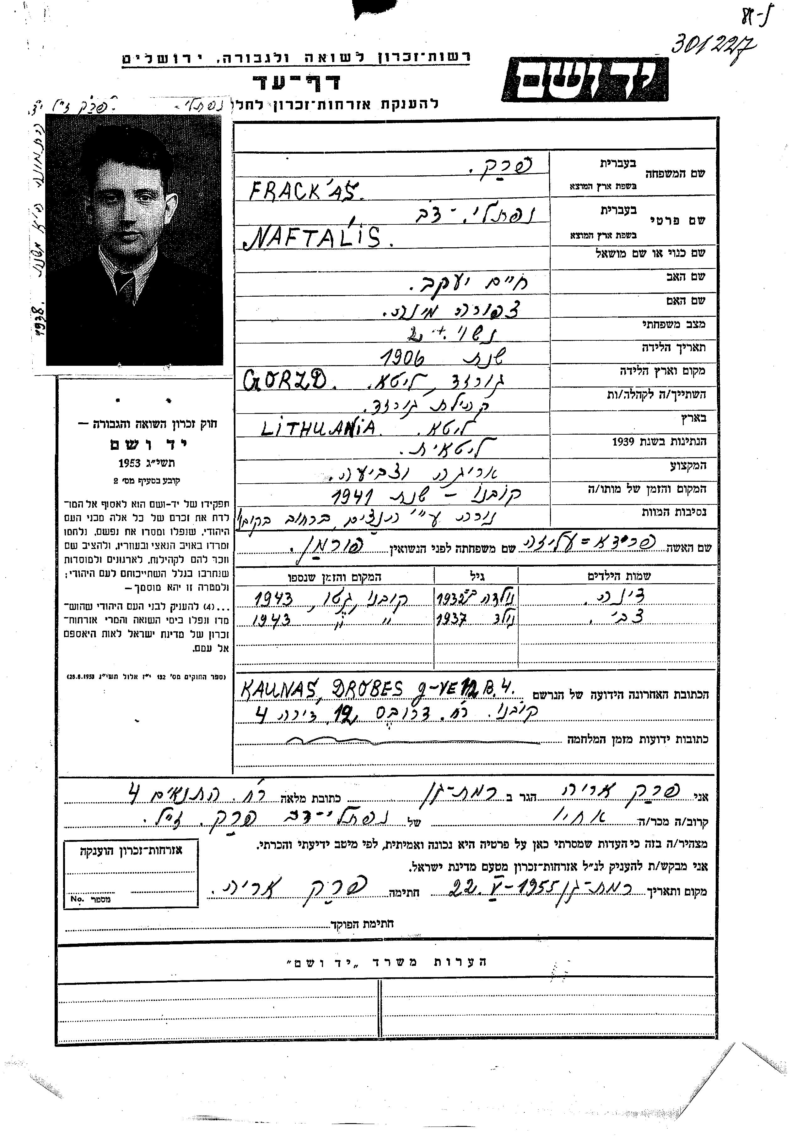 Frackas Naftalis Dov 1906 Kaunas, Litauen Gedenkblatt