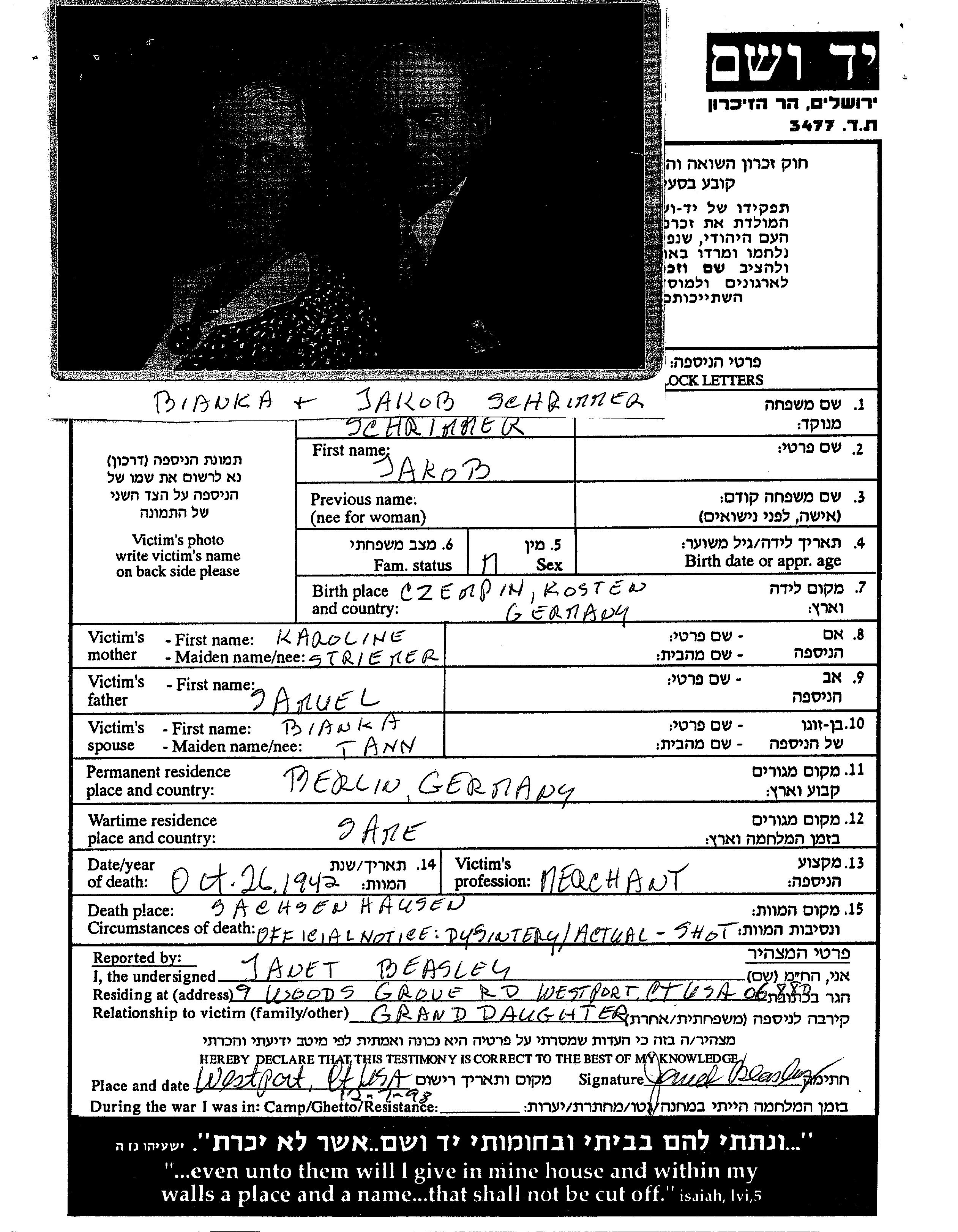 Jakob Schrimmer wurde in Czempin, Polen geboren. Er war Kaufmann/-frau. Vor dem Zweiten Weltkrieg lebte er in Berlin, Deutsches Reich.