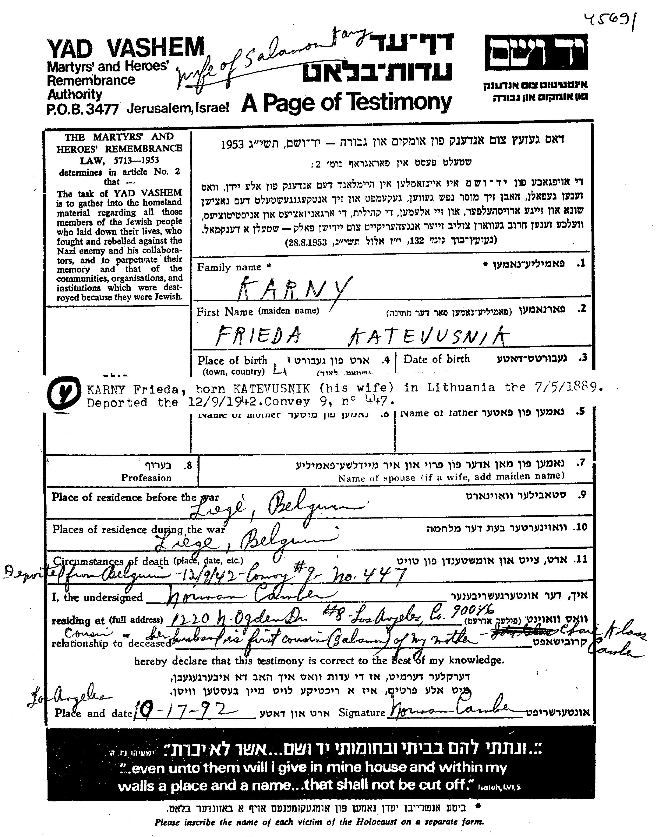 Frieda Karny, geb. Katevusnik wurde im Jahr 1889 in Litauen geboren. Sie war mit Salomon Verheiratet. Vor dem Zweiten Weltkrieg lebte sie in Liege, Belgien. Während des Krieges war sie in Liege, Belgien.