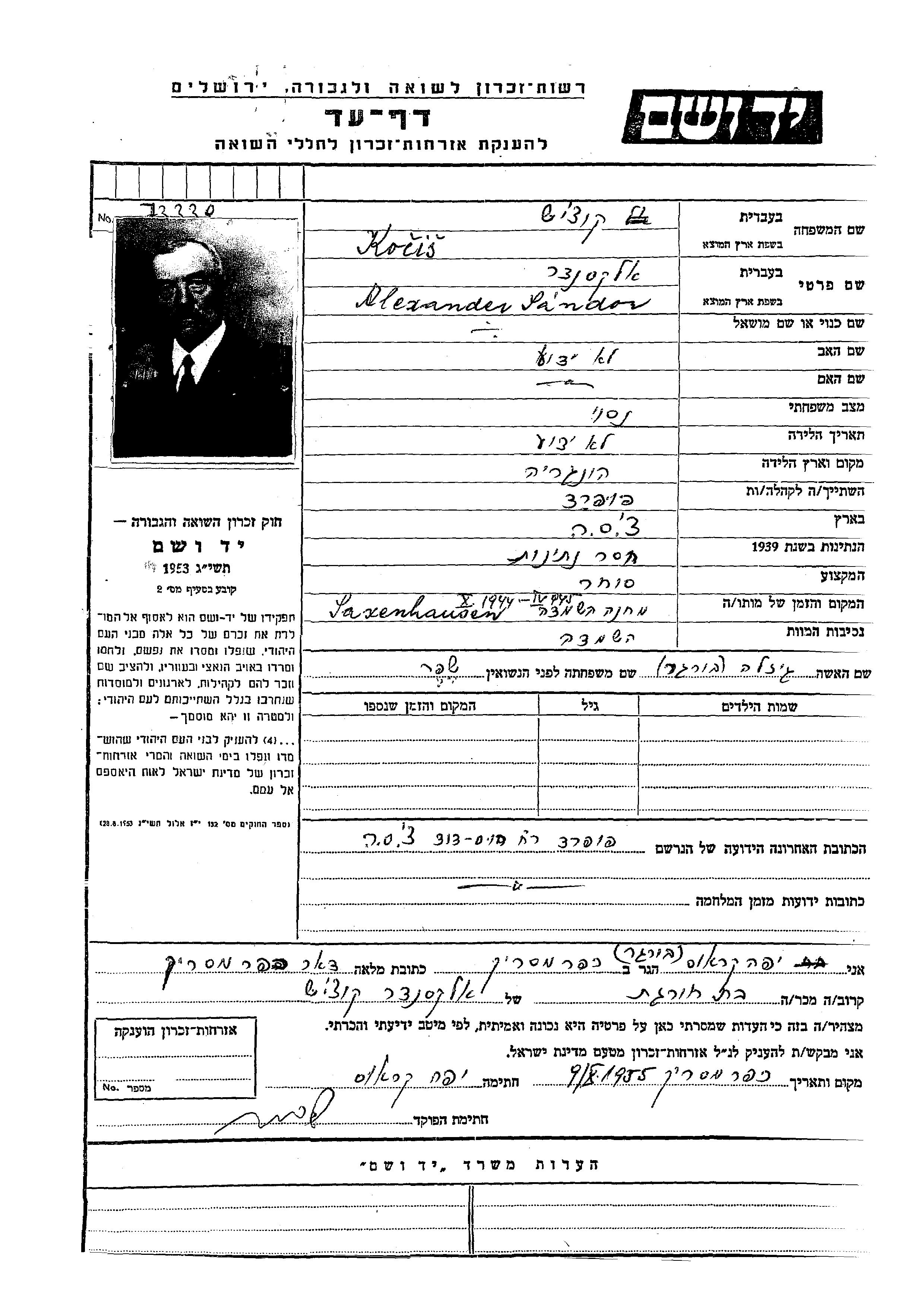 Alexander wurde in der Schoah ermordet. Todesort: Sachsenhausen, Deutsches Reich im Jahr 10/1944.