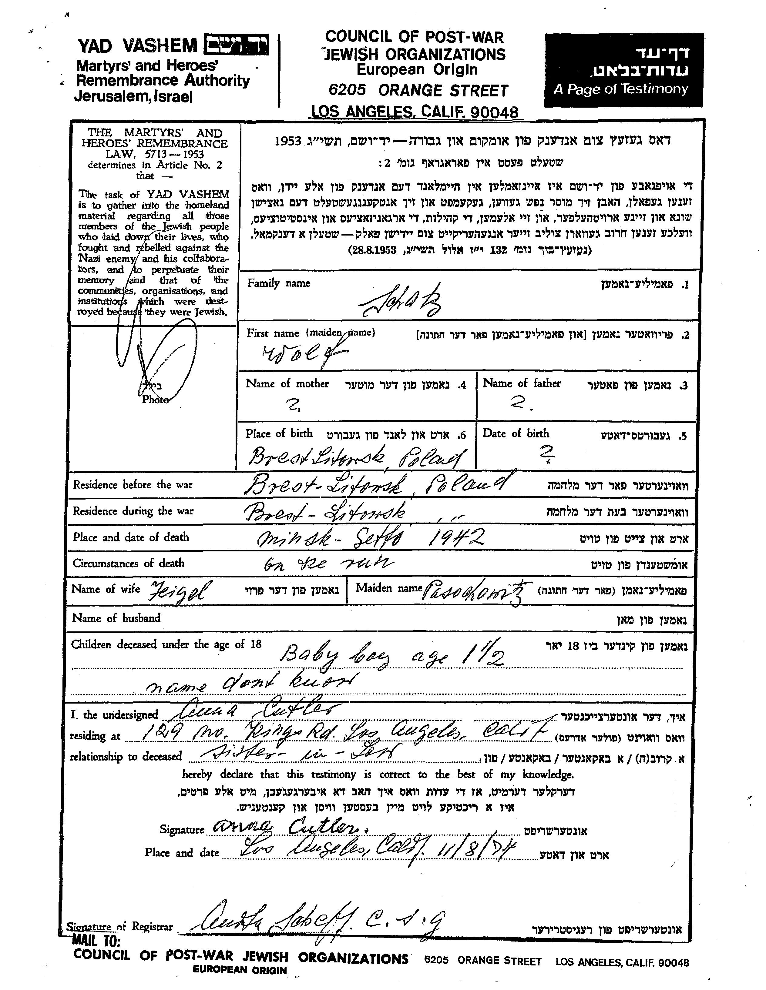 Wolf wurde in der Schoah ermordet. Todesort: Minsk, Weißrussland (UdSSR) im Jahr 1942.