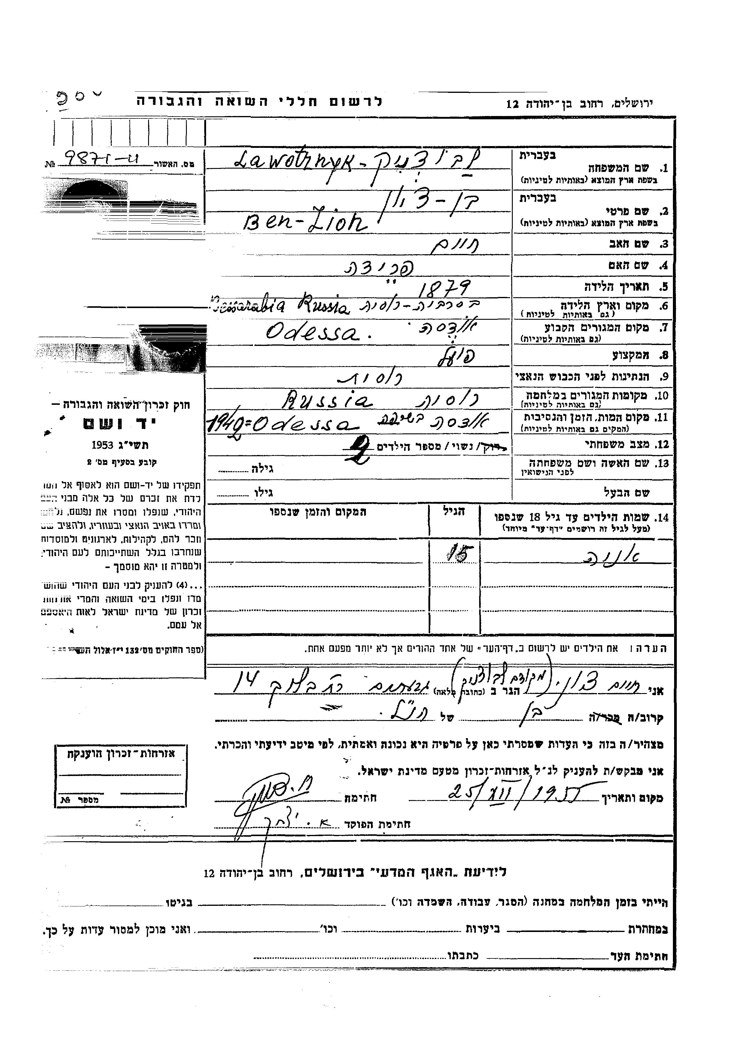 Ben Zion Lawotznyk wurde im Jahr 1879 in Bessarabia, Rumänien geboren. Er war Arbeiter/-in. Vor dem Zweiten Weltkrieg lebte er in Odessa, Ukraine (UdSSR).