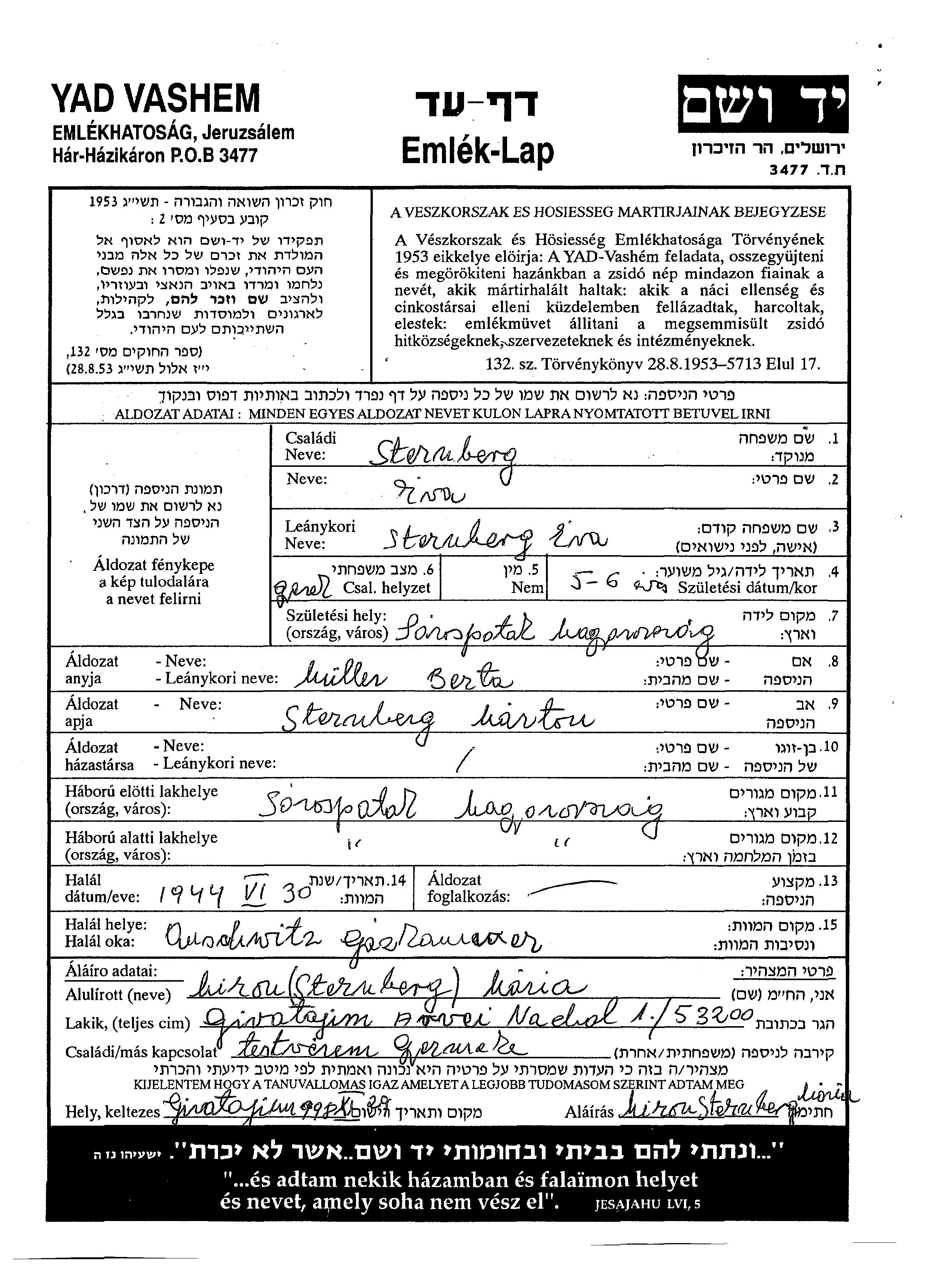 Eva Sternberg wurde in Sarospatak, Ungarn geboren. Vor dem Zweiten Weltkrieg lebte sie in Sarospatak, Ungarn.