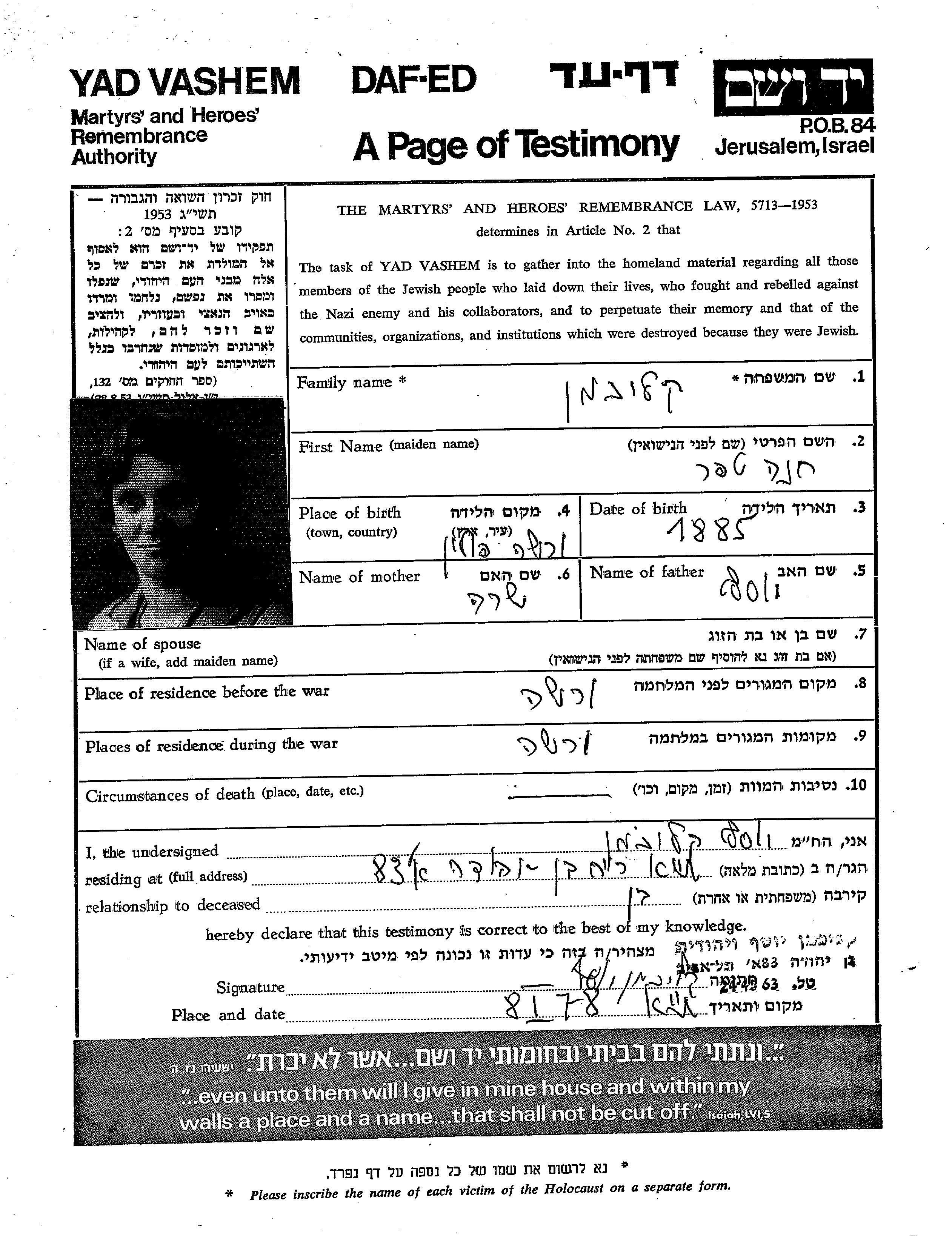 Khana Kalikhman, geb. Teper wurde im Jahr 1885 in Warszawa, Polen geboren. Vor dem Zweiten Weltkrieg lebte sie in Warszawa, Polen.