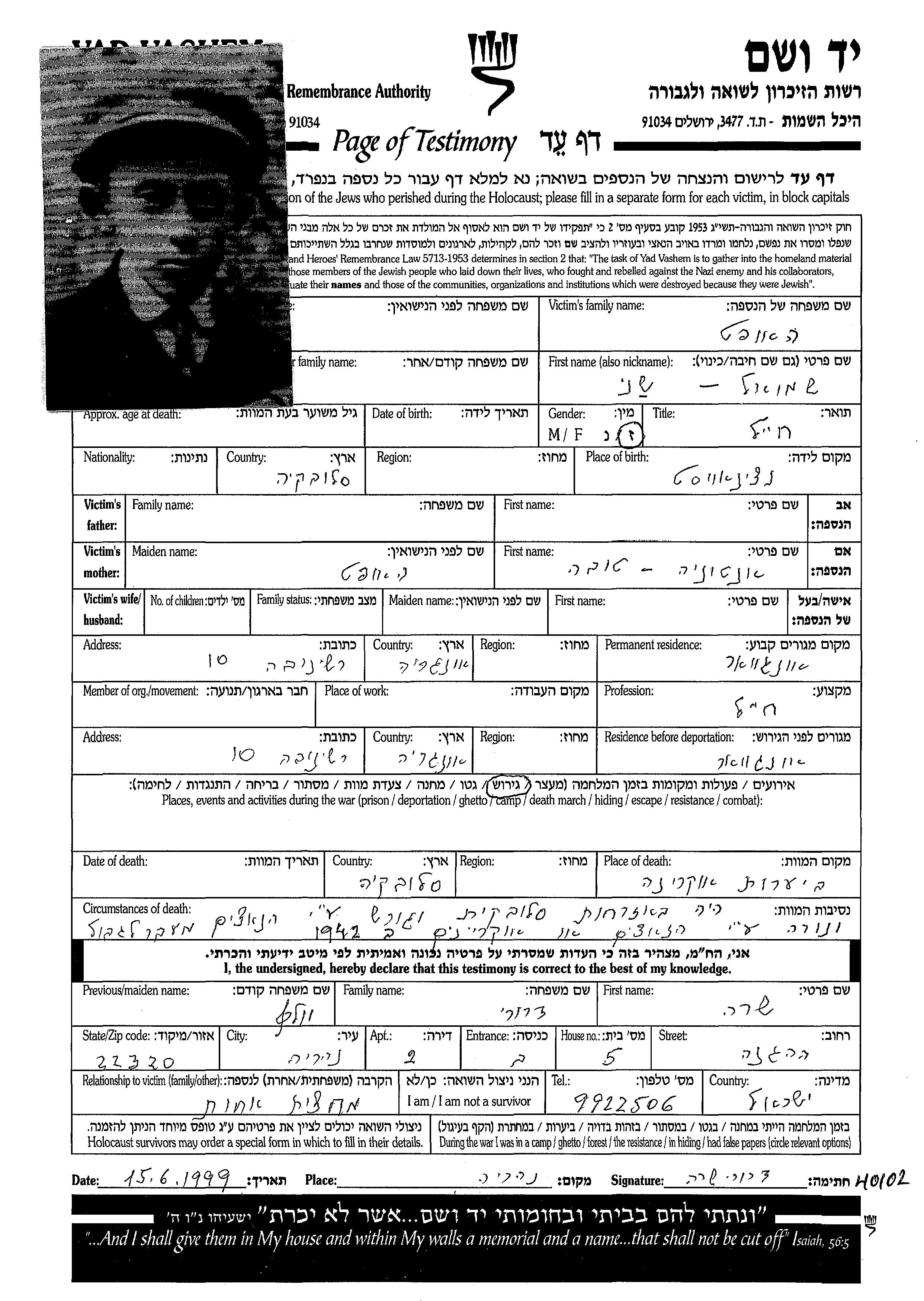 Haupt Shmuel Sanny Ungvar, Tschechoslowakei Gedenkblatt