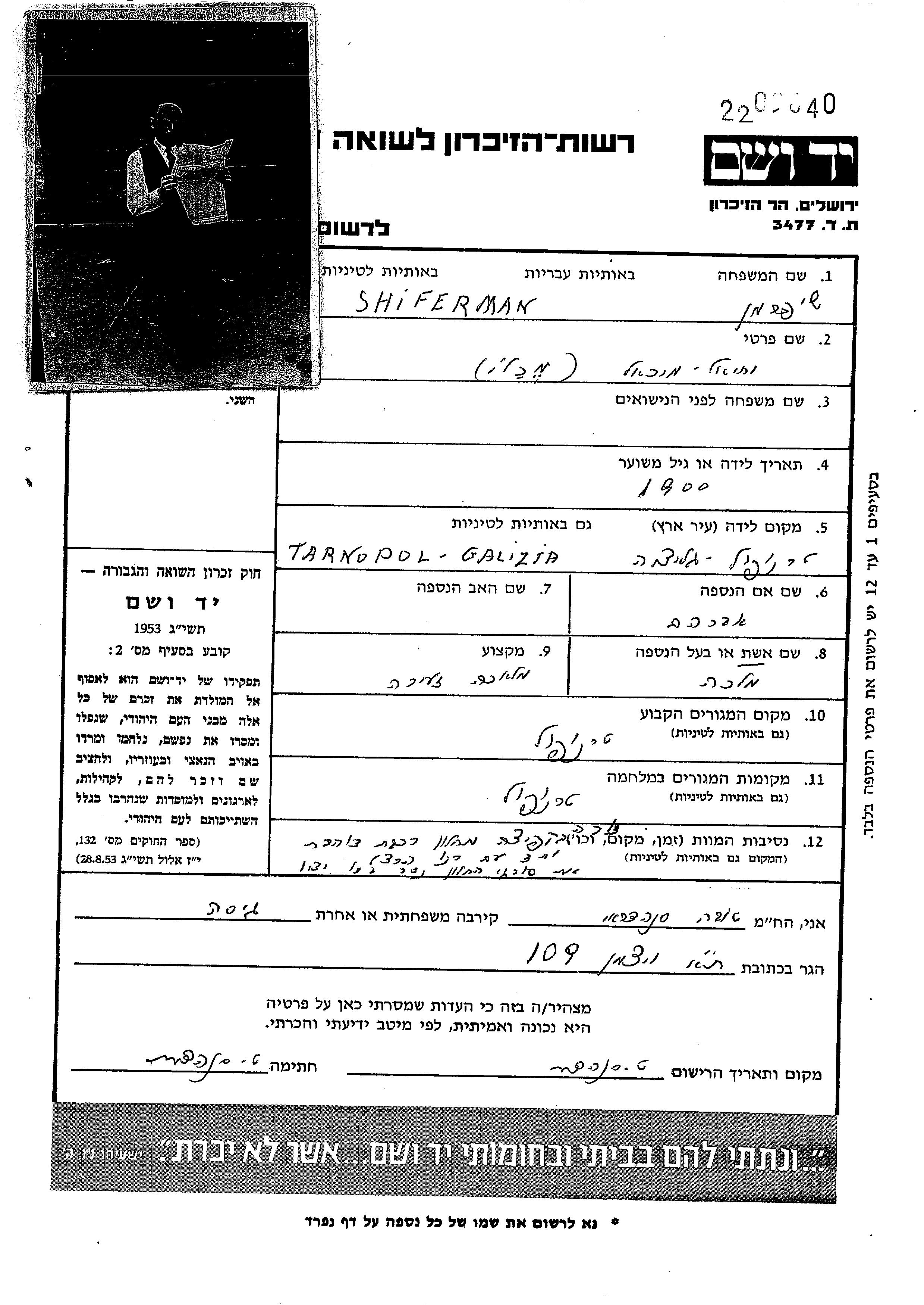Schifferman Michael 1903 Tarnopol, Polen Gedenkblatt