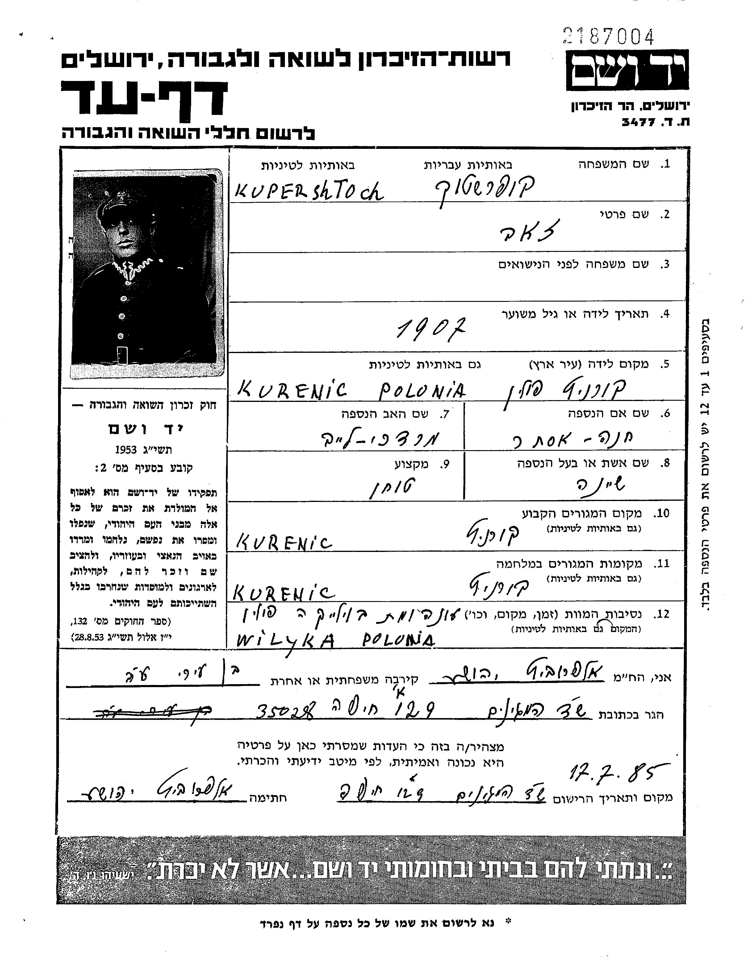 Zeev Kupershtock wurde im Jahr 1907 in Kurzeniec, Polen geboren. Er war Getreidemüller/-in. Vor dem Zweiten Weltkrieg lebte er in Kurzeniec, Polen.