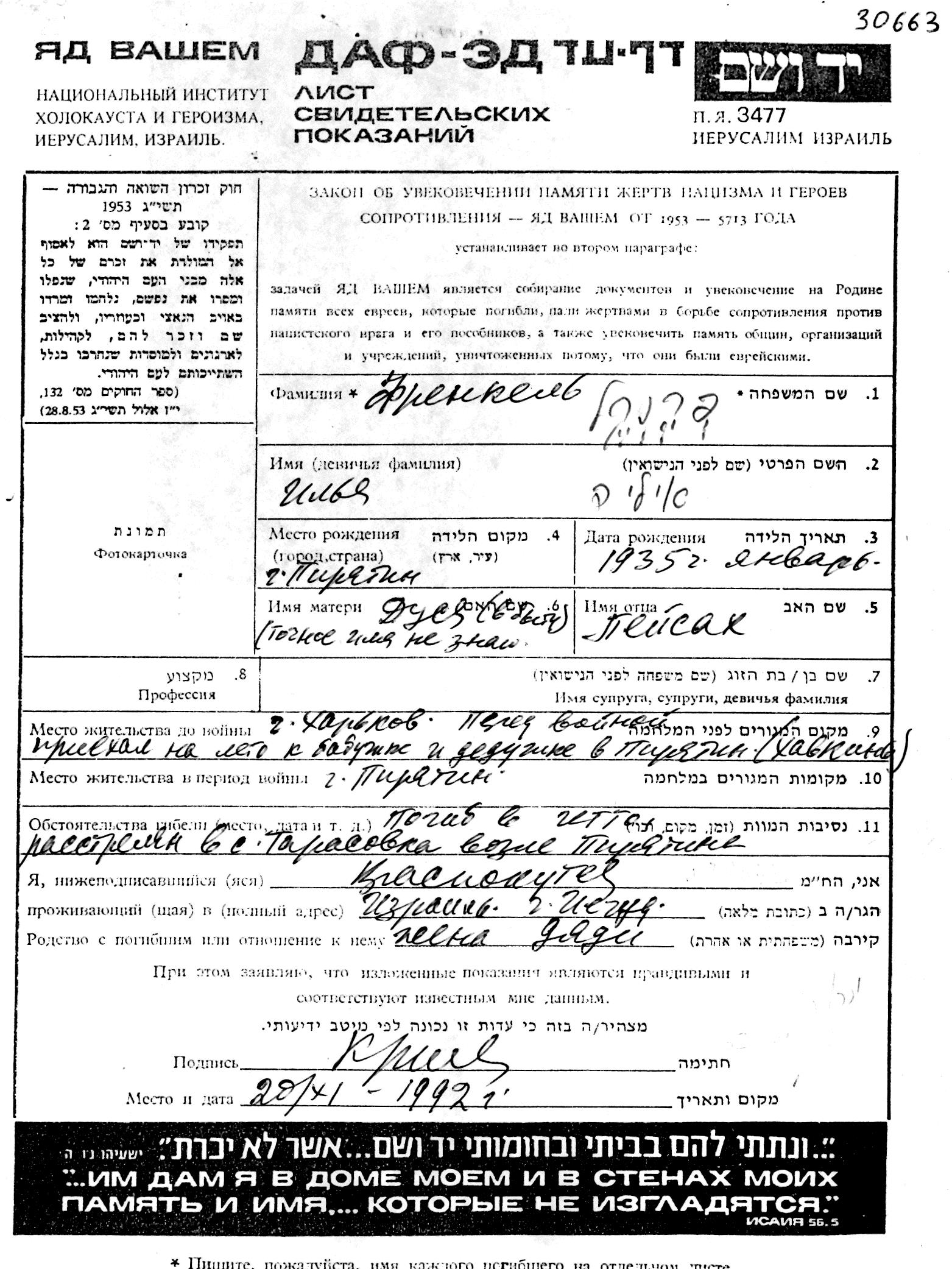 Ilia Frenkel wurde im Jahr 1935 in Piryatin, Ukraine (UdSSR) geboren. Vor dem Zweiten Weltkrieg lebte er in Kharkov, Ukraine (UdSSR).