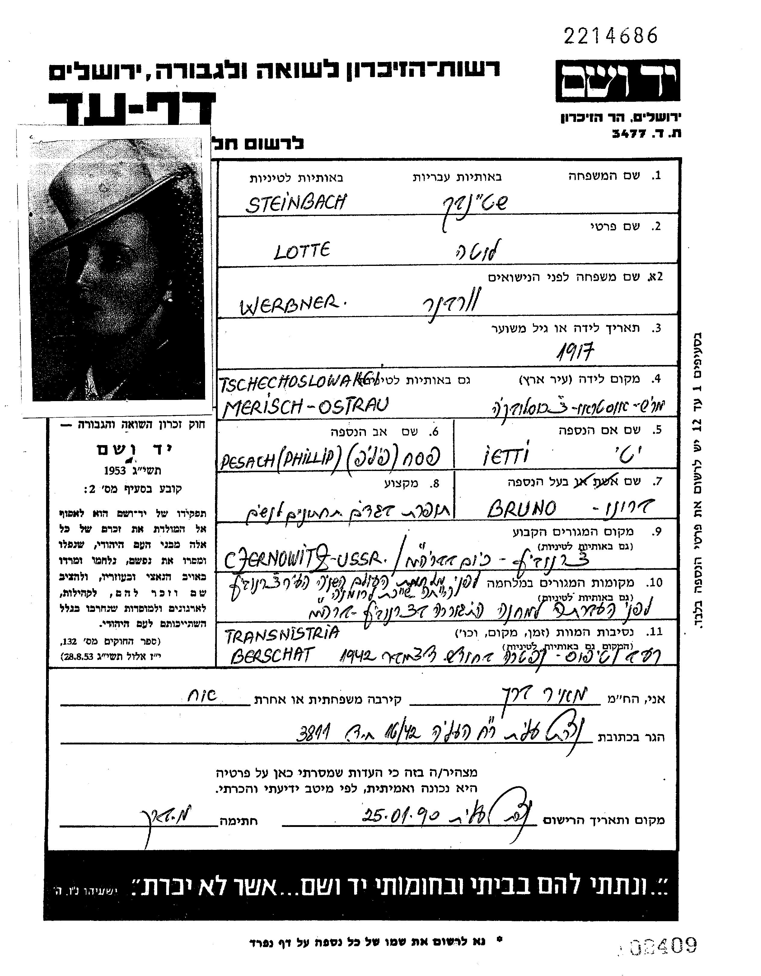 Lotte Steinbach, geb. Werbner wurde in Moravska Ostrava, Tschechoslowakei geboren. Sie war Schneiderin. Vor dem Zweiten Weltkrieg lebte sie in Cernauti, Rumänien.