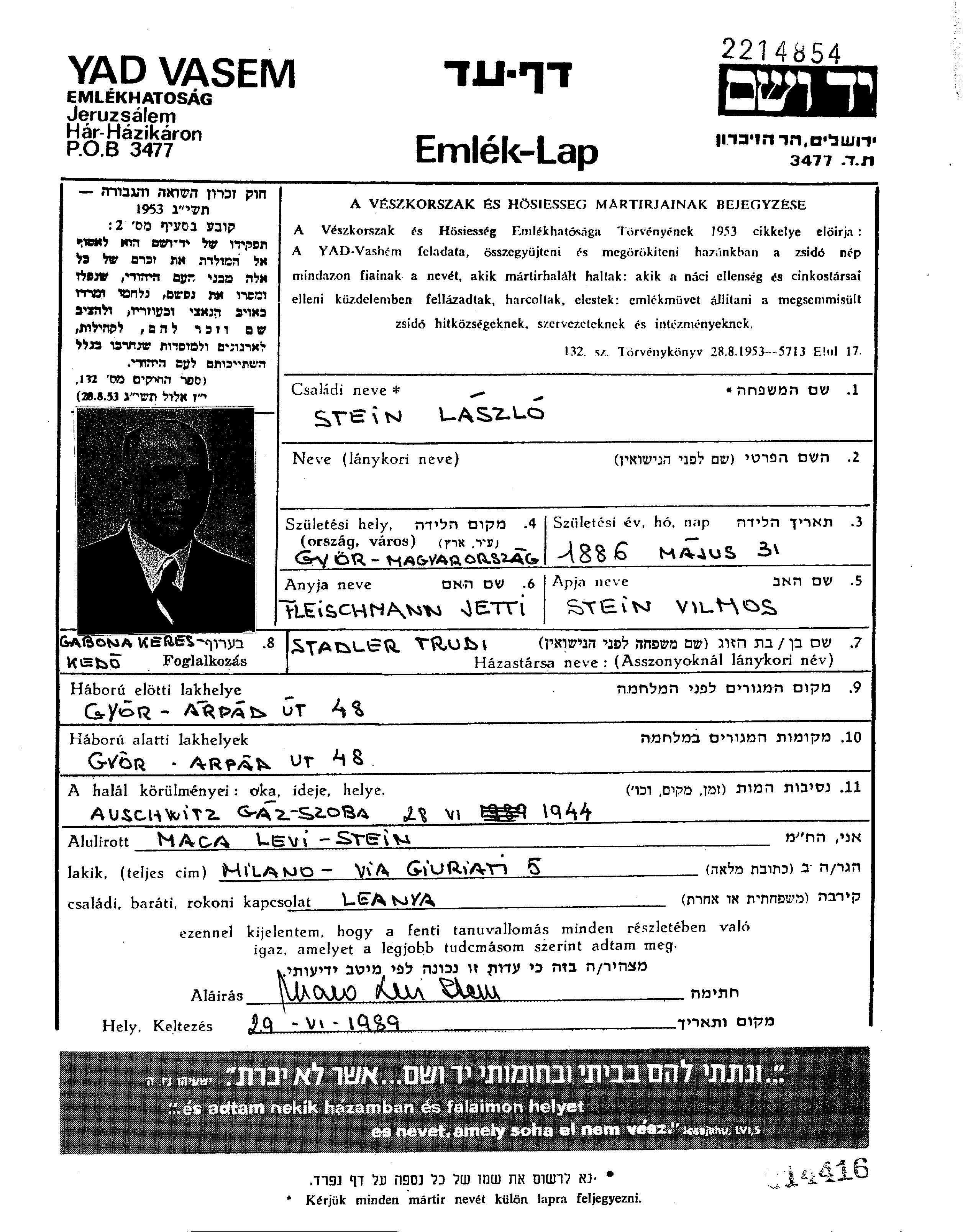 Laszlo Stein wurde im Jahr 1886 in Gyor, Ungarn geboren. Er war Kaufmann/-frau. Vor dem Zweiten Weltkrieg lebte er in Gyor, Ungarn.