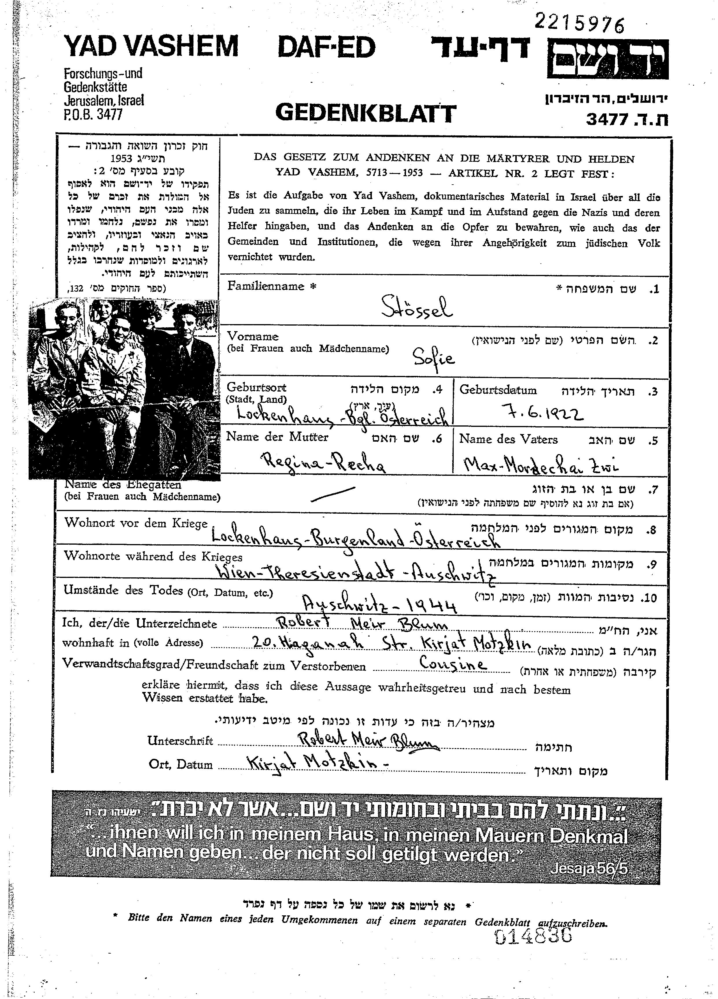 Stössel Shtesel | Sofie | 1922 | Lockenhaus, Österreich | Gedenkblatt |