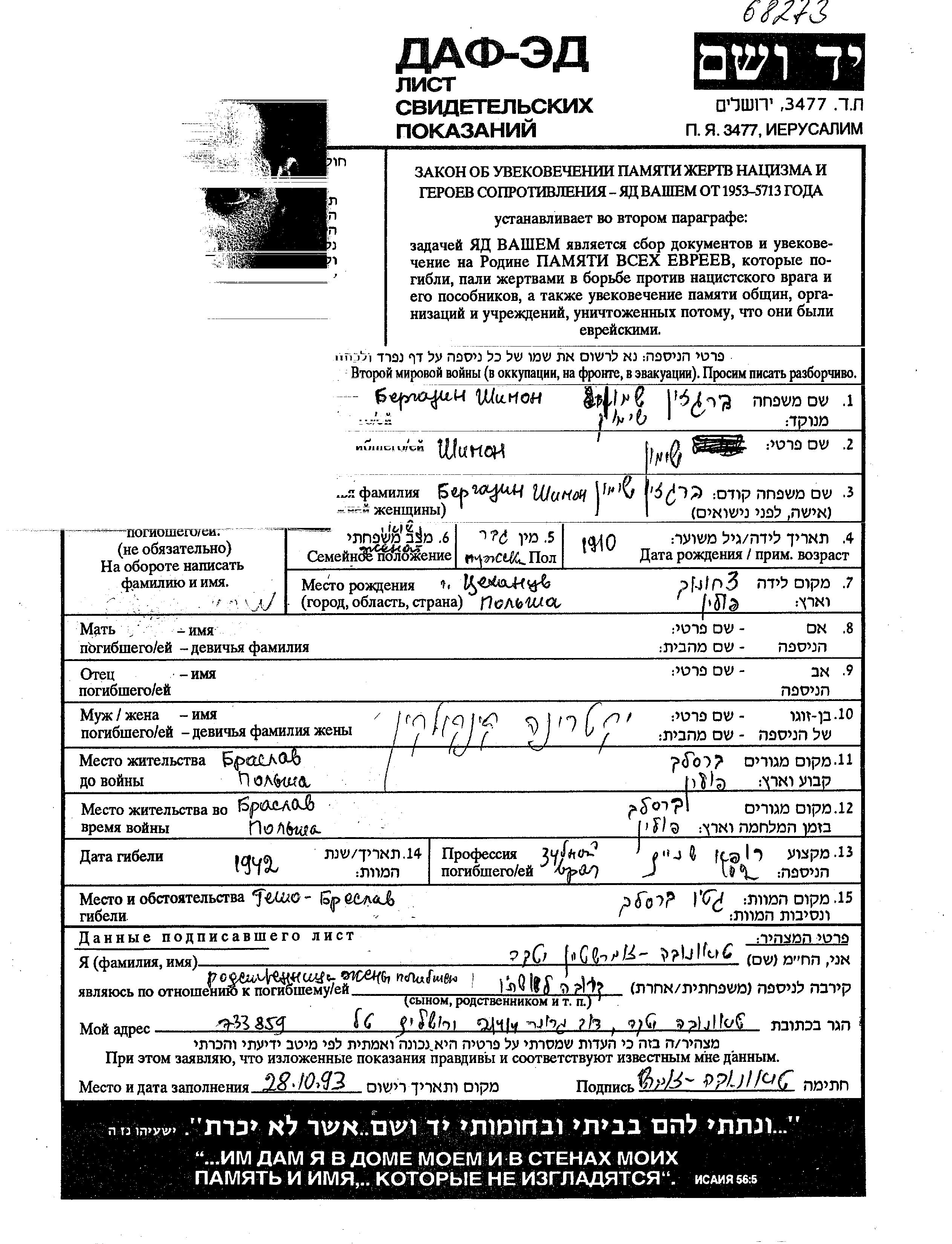 Shimon wurde in der Schoah ermordet. Todesort: Braslaw, Polen im Jahr 1942.