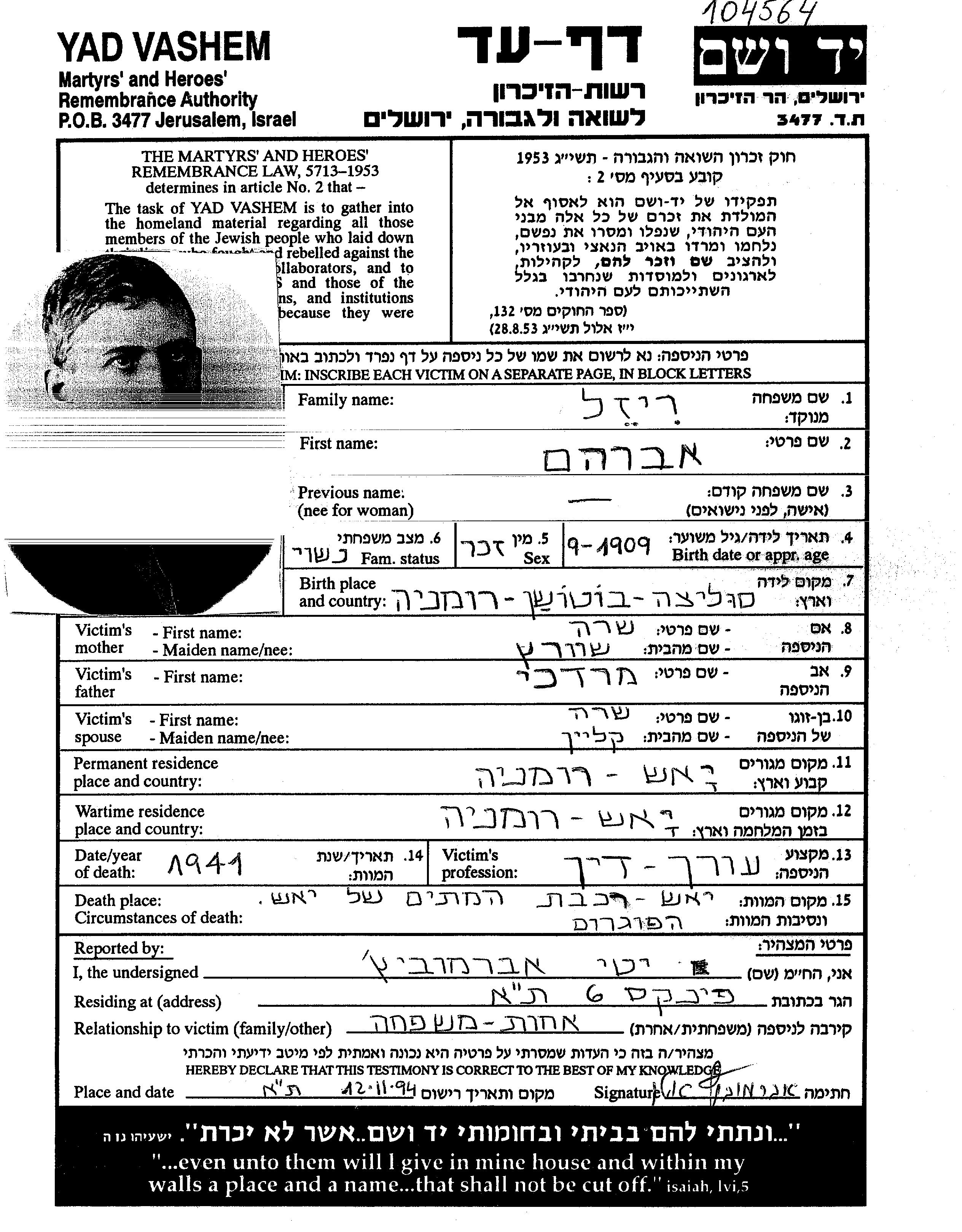 Avraham wurde in der Schoah ermordet. Todesort: Iasi, Rumänien im Jahr 1941.