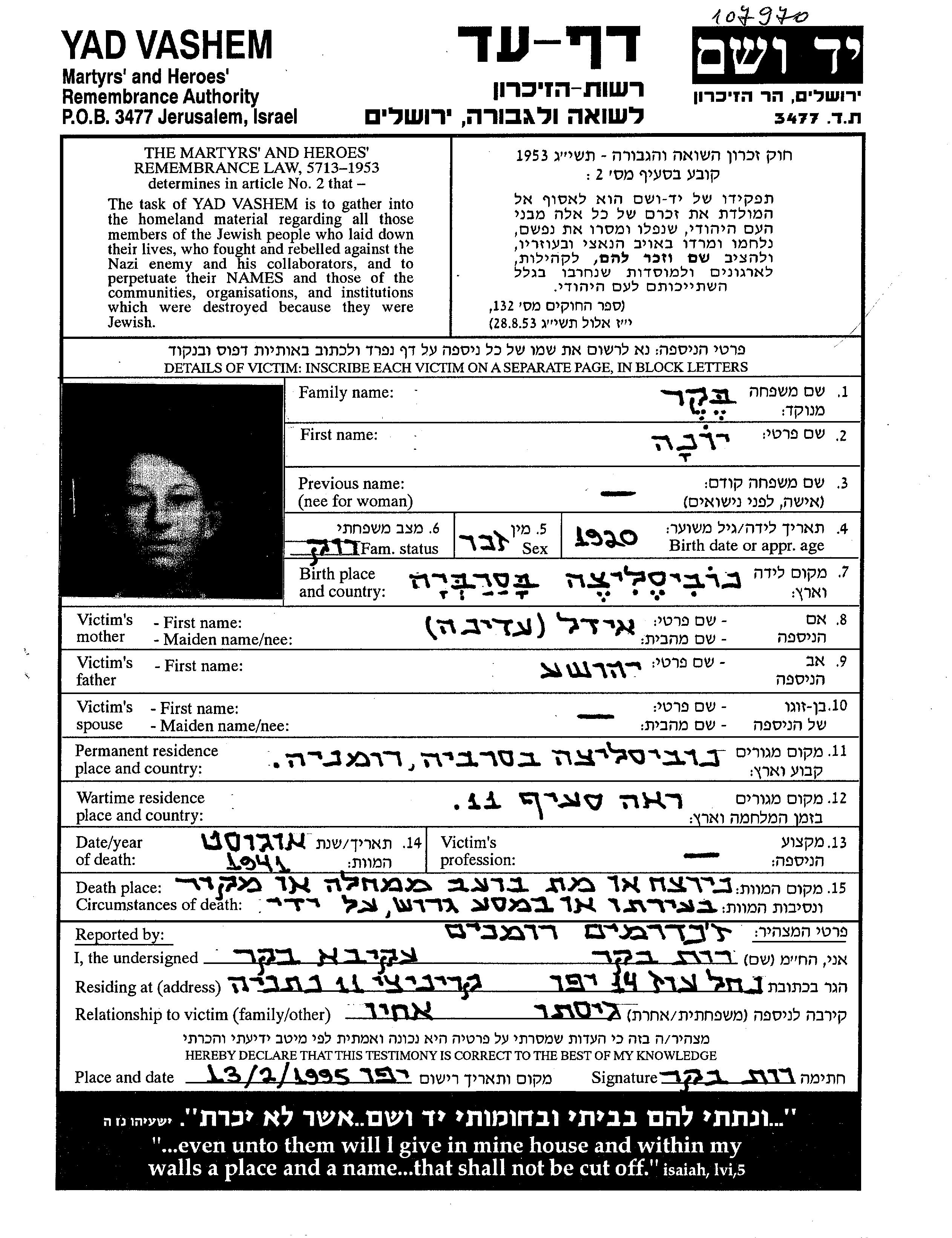 Yona Beker wurde im Jahr 1920 in Sulita, Rumänien geboren. Vor dem Zweiten Weltkrieg lebte er in Sulita, Rumänien.
