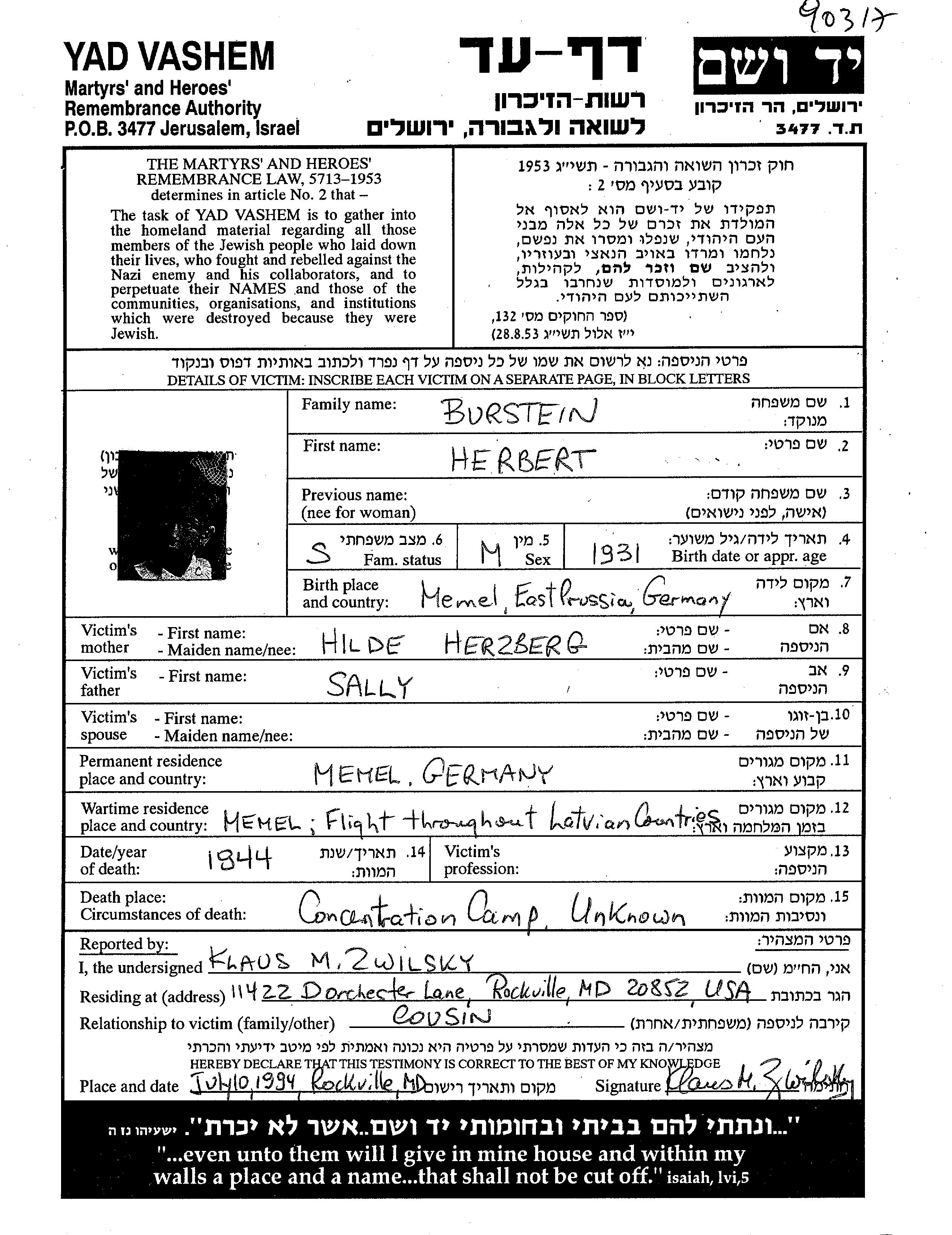 Herbert Burstein wurde im Jahr 1931 in Klaipeda, Litauen geboren. Vor dem Zweiten Weltkrieg lebte er in Klaipeda, Litauen.