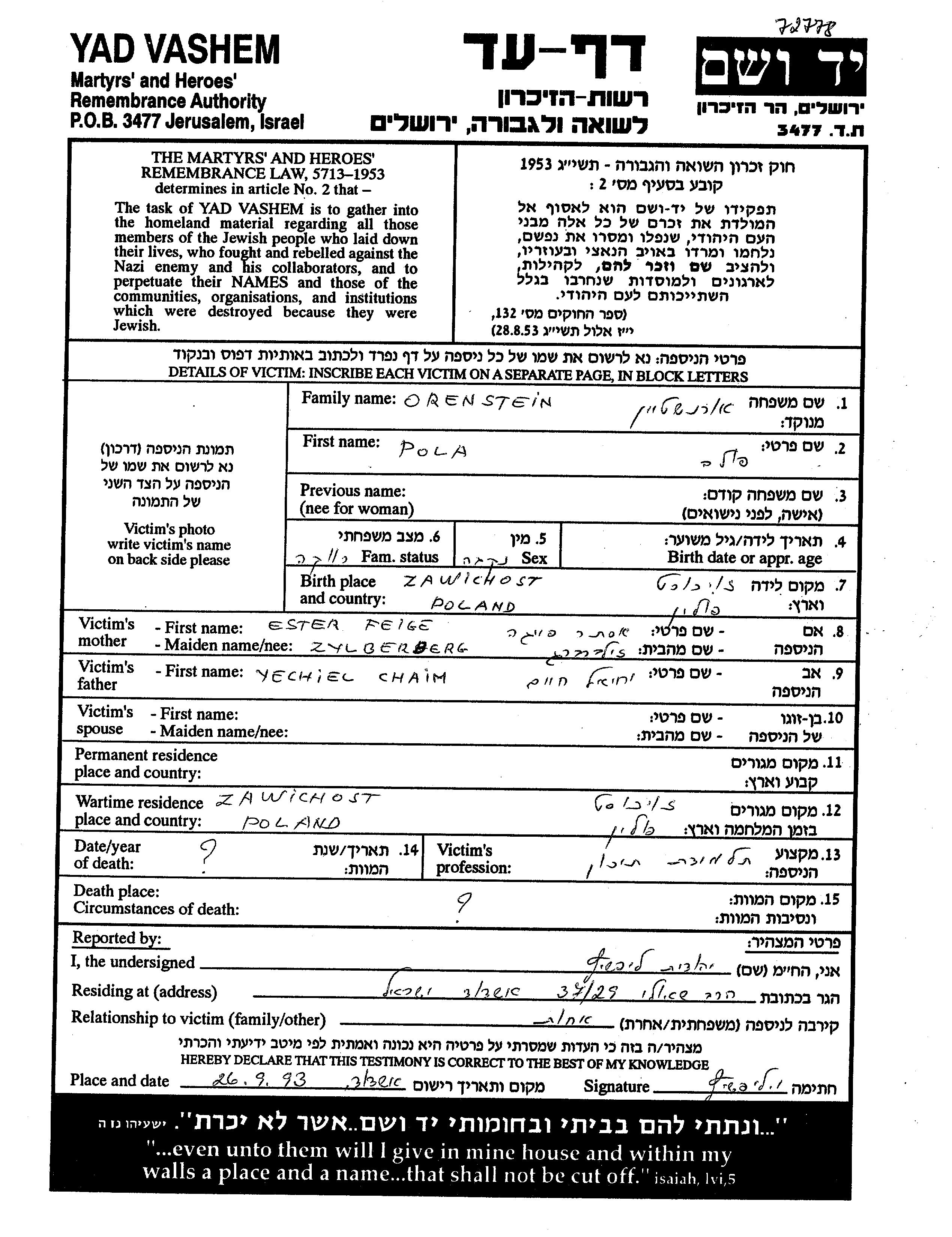 Pola Orenstein wurde in Zawichost, Polen geboren. Sie war Schüler/-in. Vor dem Zweiten Weltkrieg lebte sie in Zawichost, Polen.