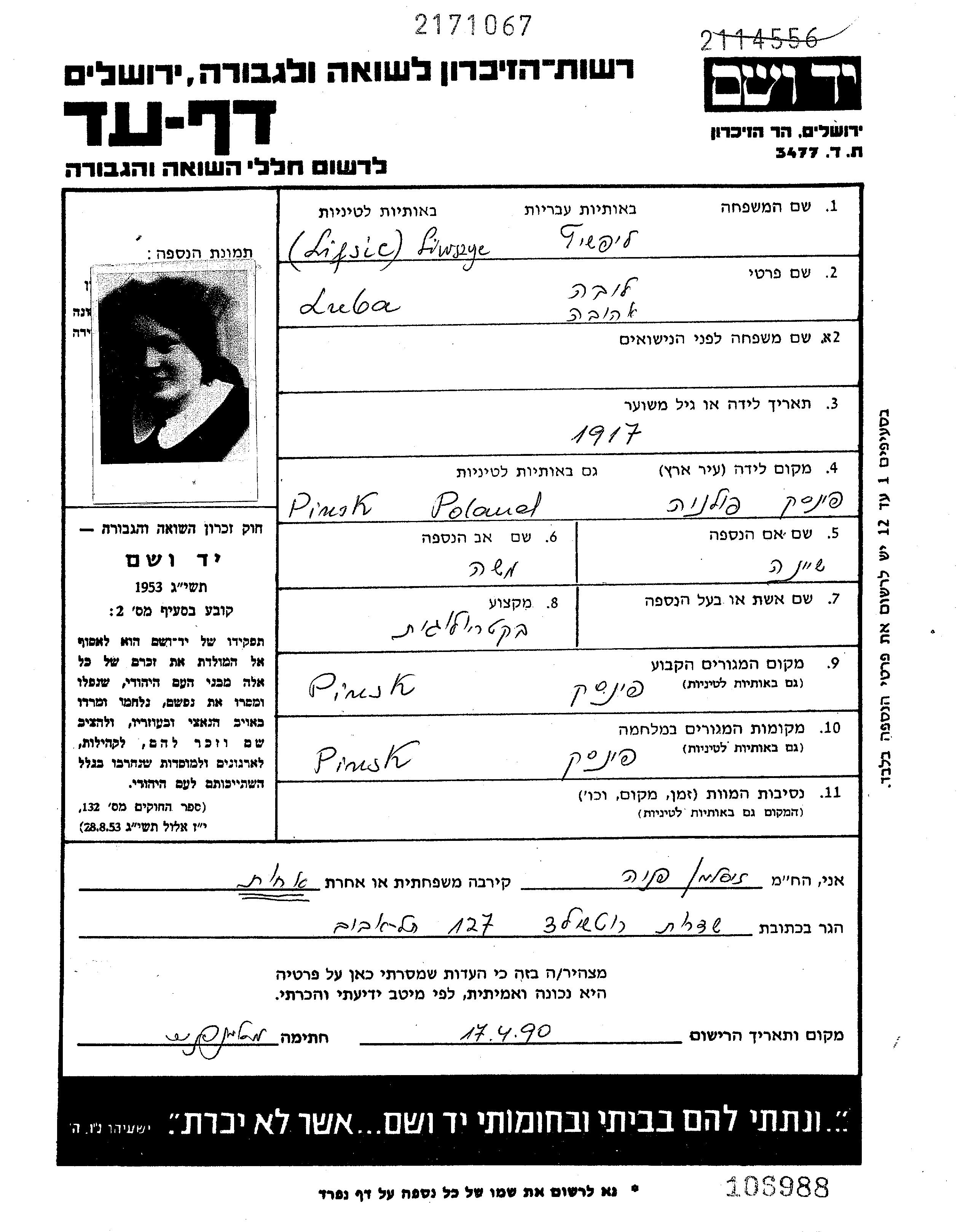 Liwszyc Luba 1917 Pinsk, Polen Verfolgtenliste