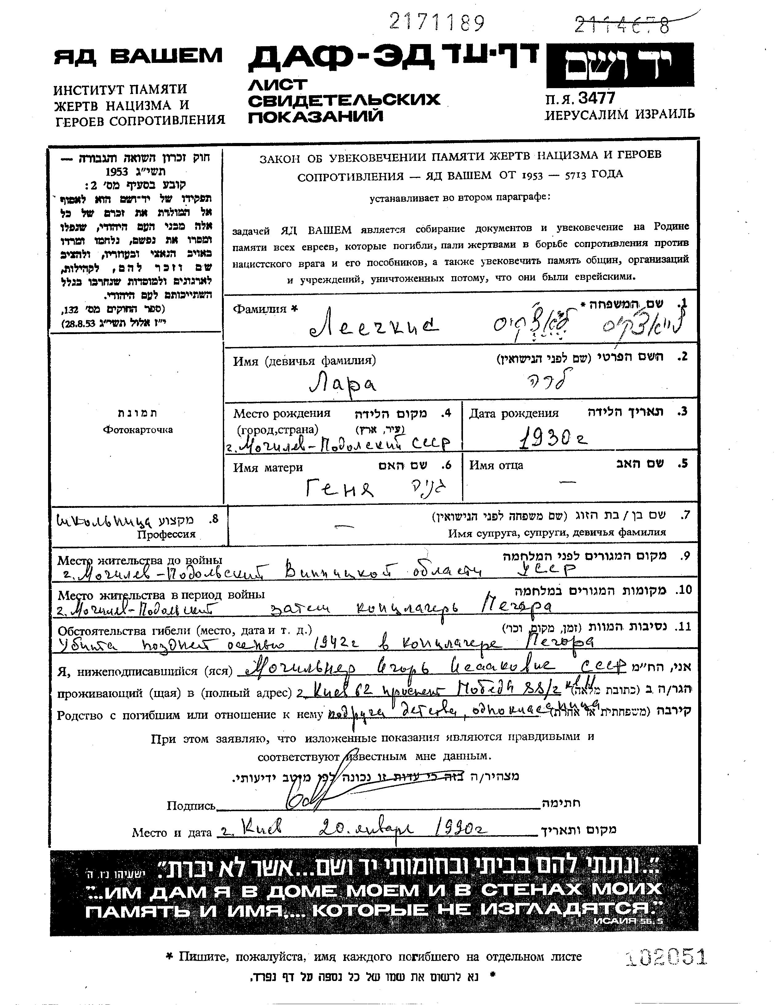 Lara Lera Leyechkis wurde im Jahr 1930 in Mogilev Podolskiy, Ukraine (UdSSR) geboren. Sie war Schüler/-in. Vor dem Zweiten Weltkrieg lebte sie in Mogilev Podolskiy, Ukraine (UdSSR).