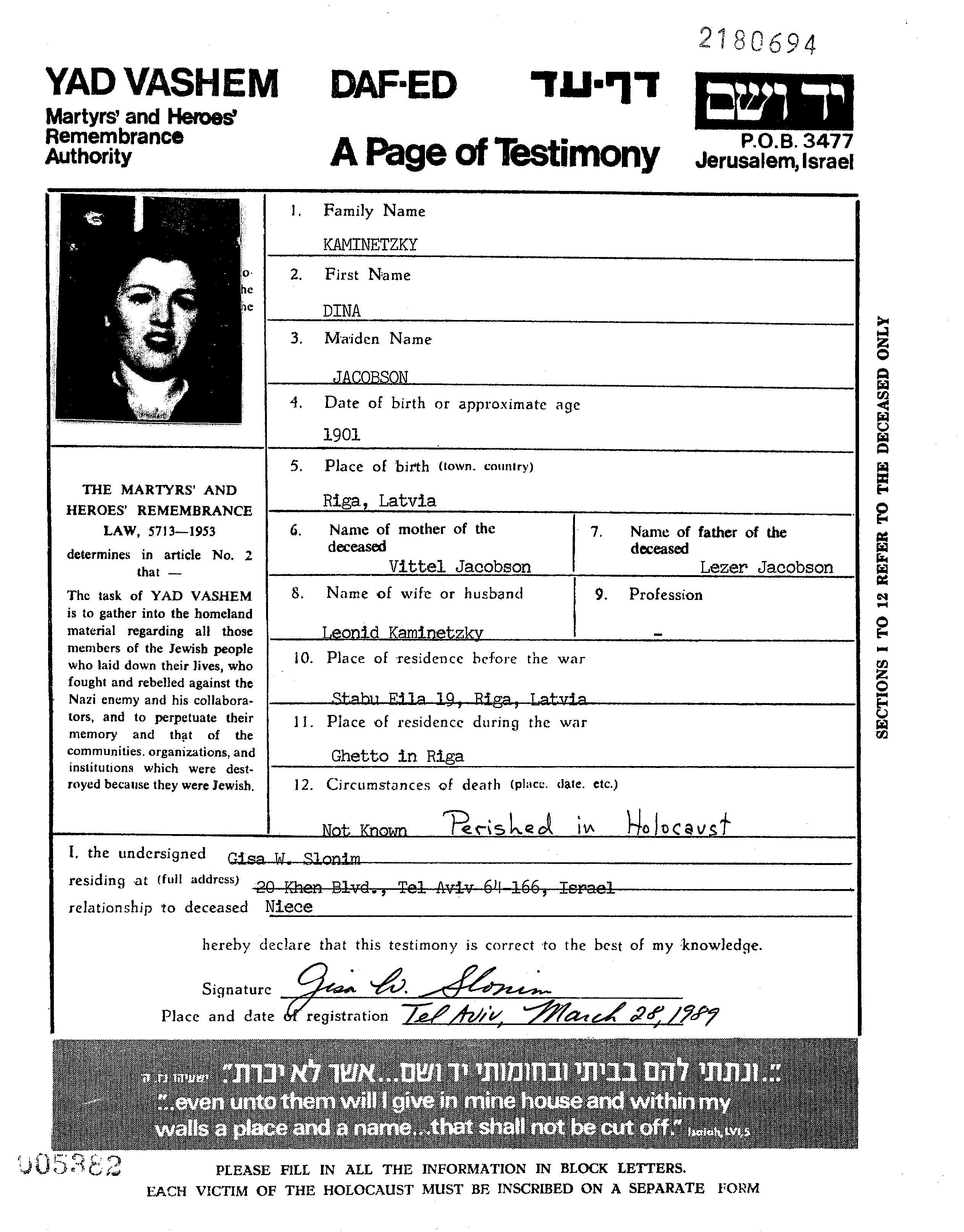 Dina Kaminetzky, geb. Jacobson wurde im Jahr 1901 in Riga, Lettland geboren. Vor dem Zweiten Weltkrieg lebte sie in Riga, Lettland.
