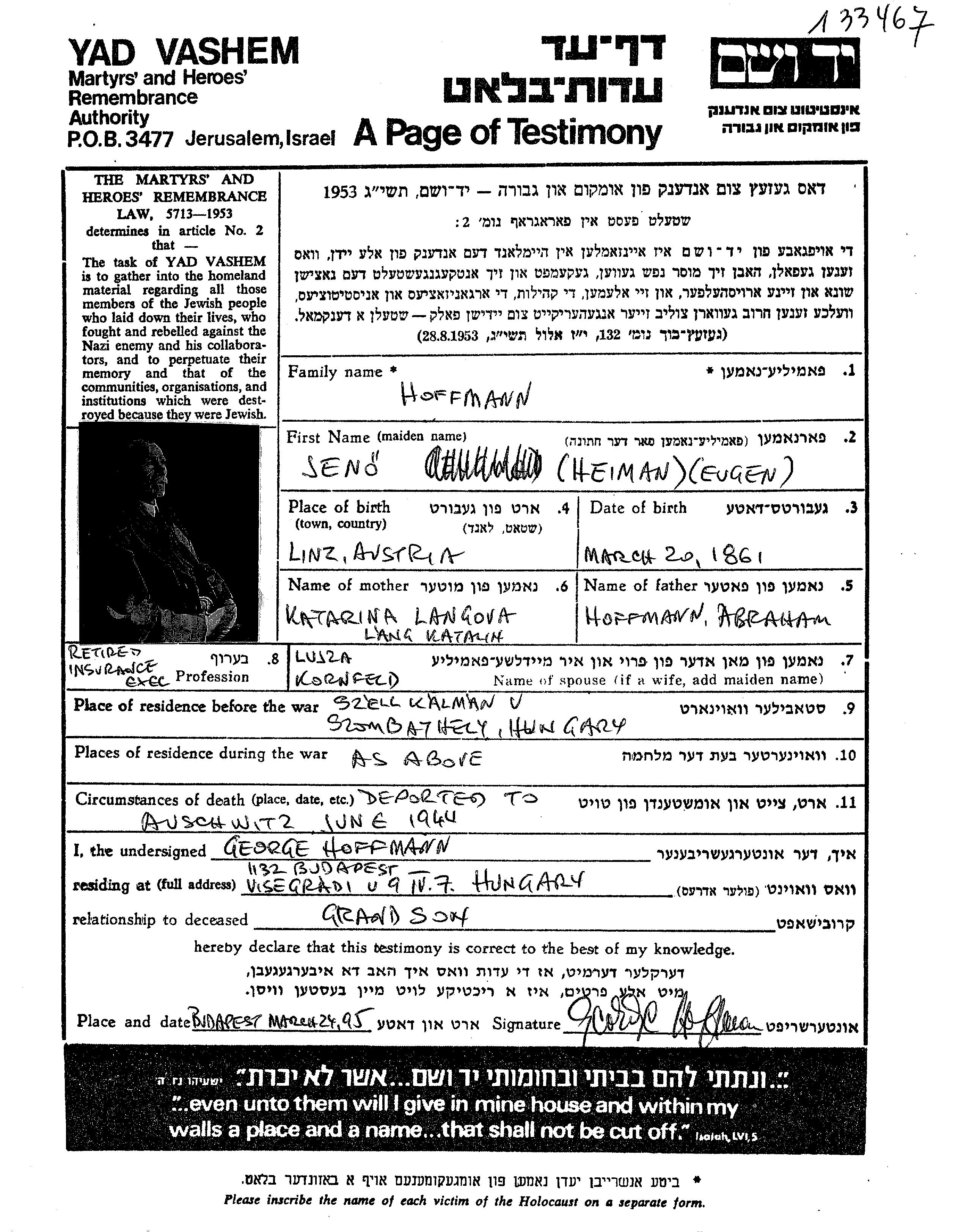 Hoffmann | Jeno Heiman Eugen | 1861 | Szombathely, Ungarn | Gedenkblatt |