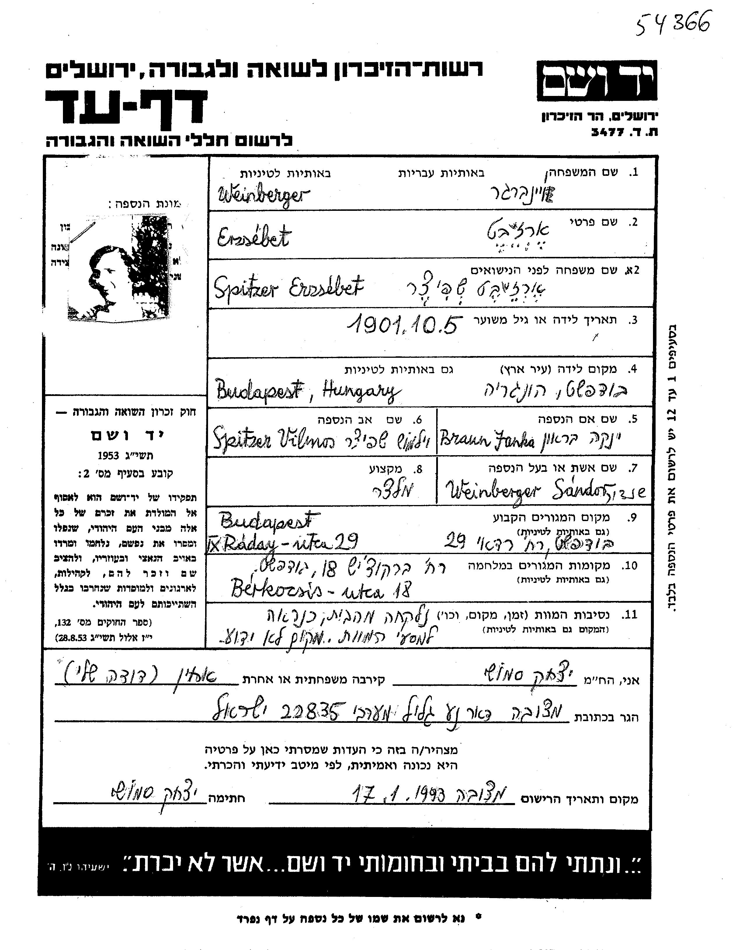 Erzsbet Weinberger, geb. Spitzer wurde im Jahr 1901 in Budapest, Ungarn geboren. Sie war Kellner/in. Vor dem Zweiten Weltkrieg lebte sie in Budapest, Ungarn.