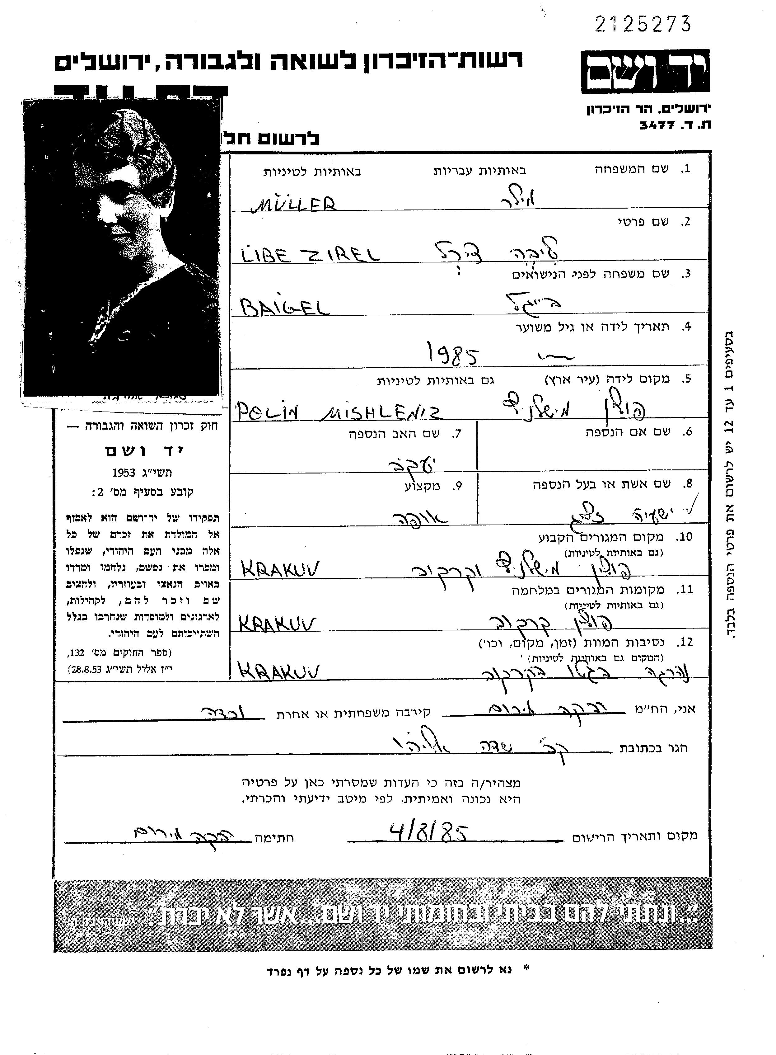 Müller Liba Zirel 1885 Krakow, Polen Gedenkblatt