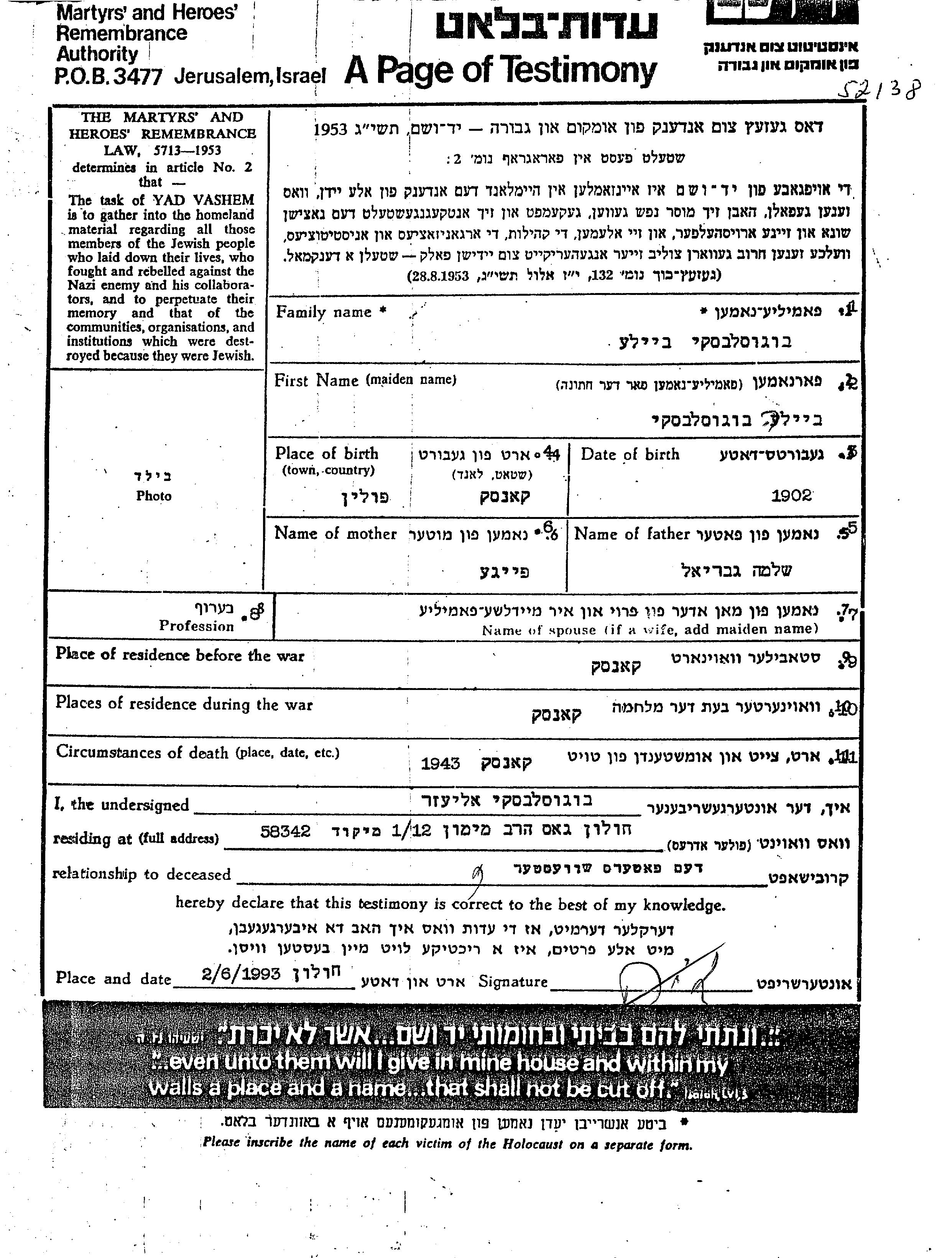 Beila Boguslavski wurde im Jahr 1902 in Kansk, Polen geboren. Sie war die Tochter von Shloma Gabriel und Feiga. Vor dem Zweiten Weltkrieg lebte sie in Kansk, Polen. Während des Krieges war sie in Kansk, Polen.