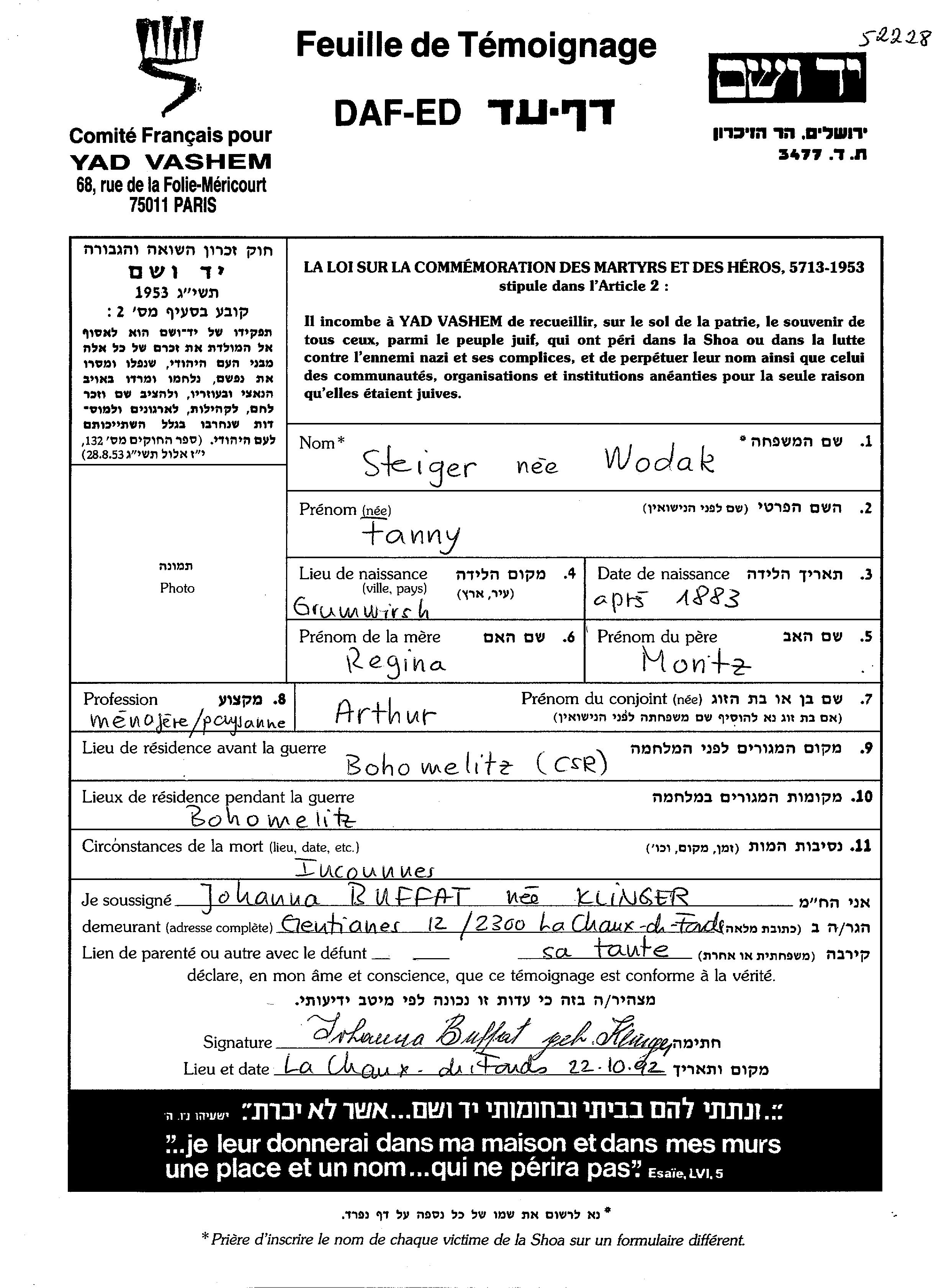 Fanny Steiger, geb. Wodak wurde im Jahr 1883 in Grumwirsch, Tschechoslowakei geboren. Sie war die Tochter von Moritz und Regina, geb. Wohlmut. Sie war Vertreter/-in und mit Arthur Verheiratet. Vor dem Zweiten Weltkrieg lebte sie in Bohomelitz, Tschechoslowakei. Während des Krieges war sie in Bohomelitz, Tschechoslowakei.
