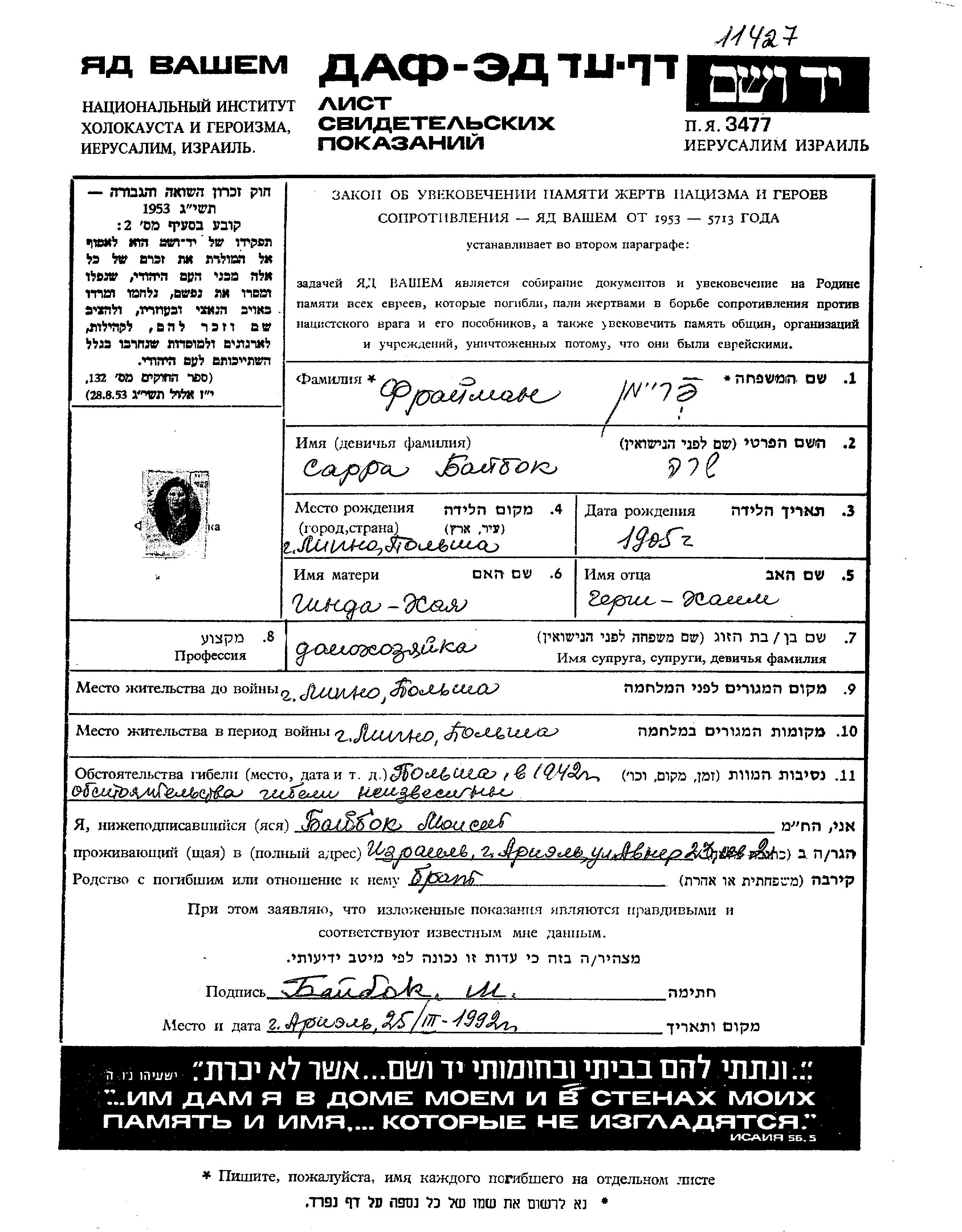 Sara Fraiman, geb. Baibok wurde im Jahr 1905 in Lipno, Polen geboren. Sie war Hausfrau. Vor dem Zweiten Weltkrieg lebte sie in Lipno, Polen.