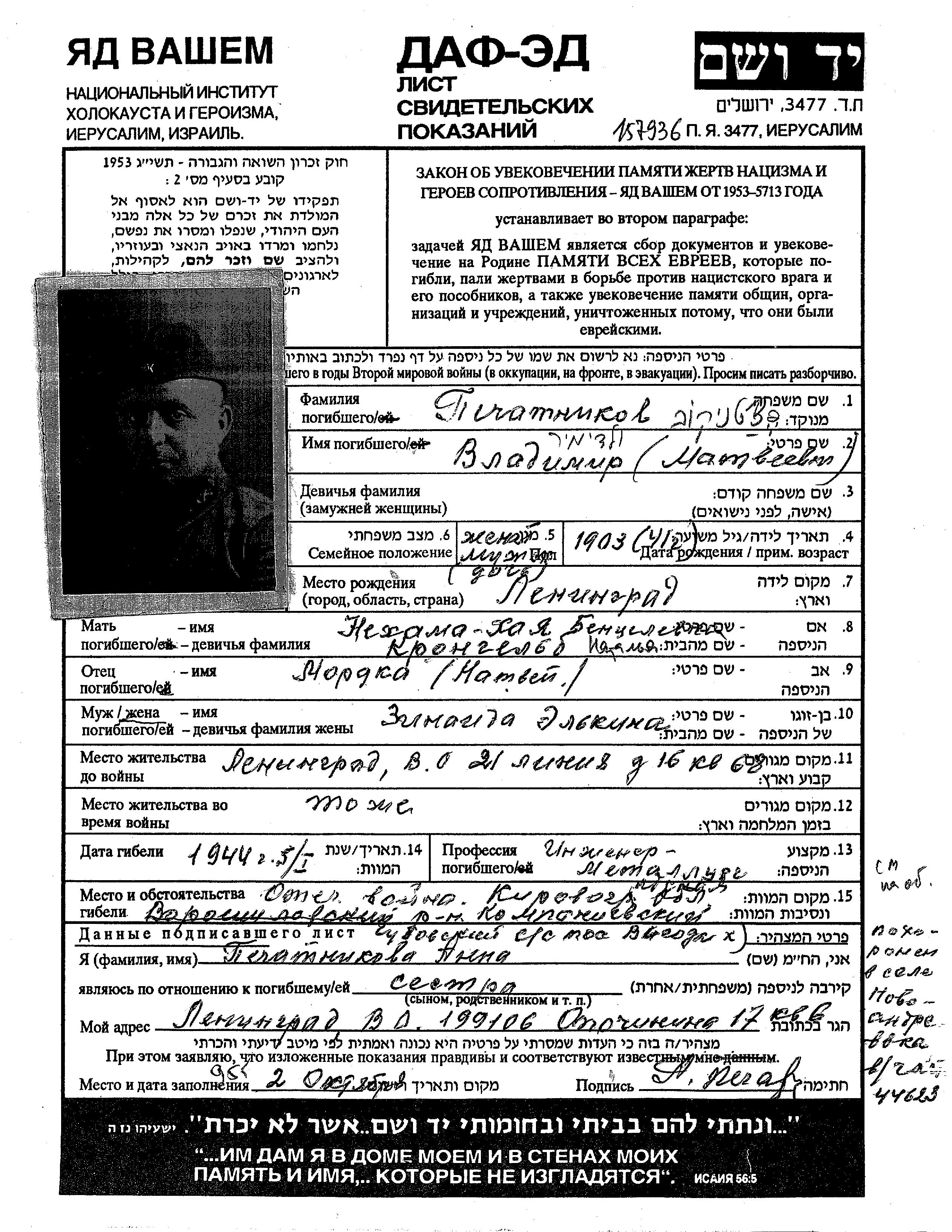Vladimir Pechatnikov wurde im Jahr 1903 in Leningrad, Russland (UdSSR) geboren. Er war Ingenieur. Vor dem Zweiten Weltkrieg lebte er in Leningrad, Russland (UdSSR).
