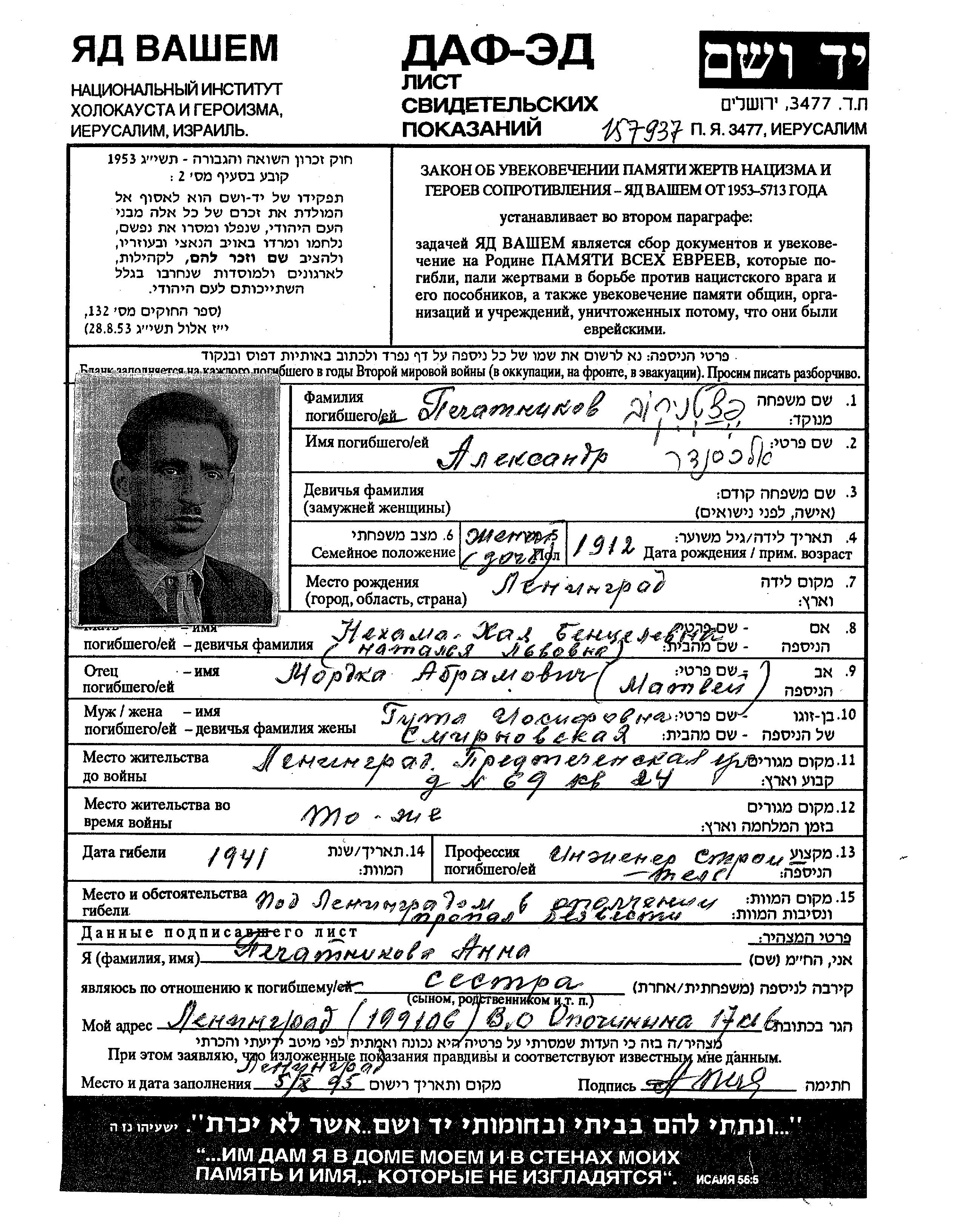 Aleksandr wurde in der Schoah ermordet. Todesort: Leningrad, Russland (UdSSR) im Jahr 1941.