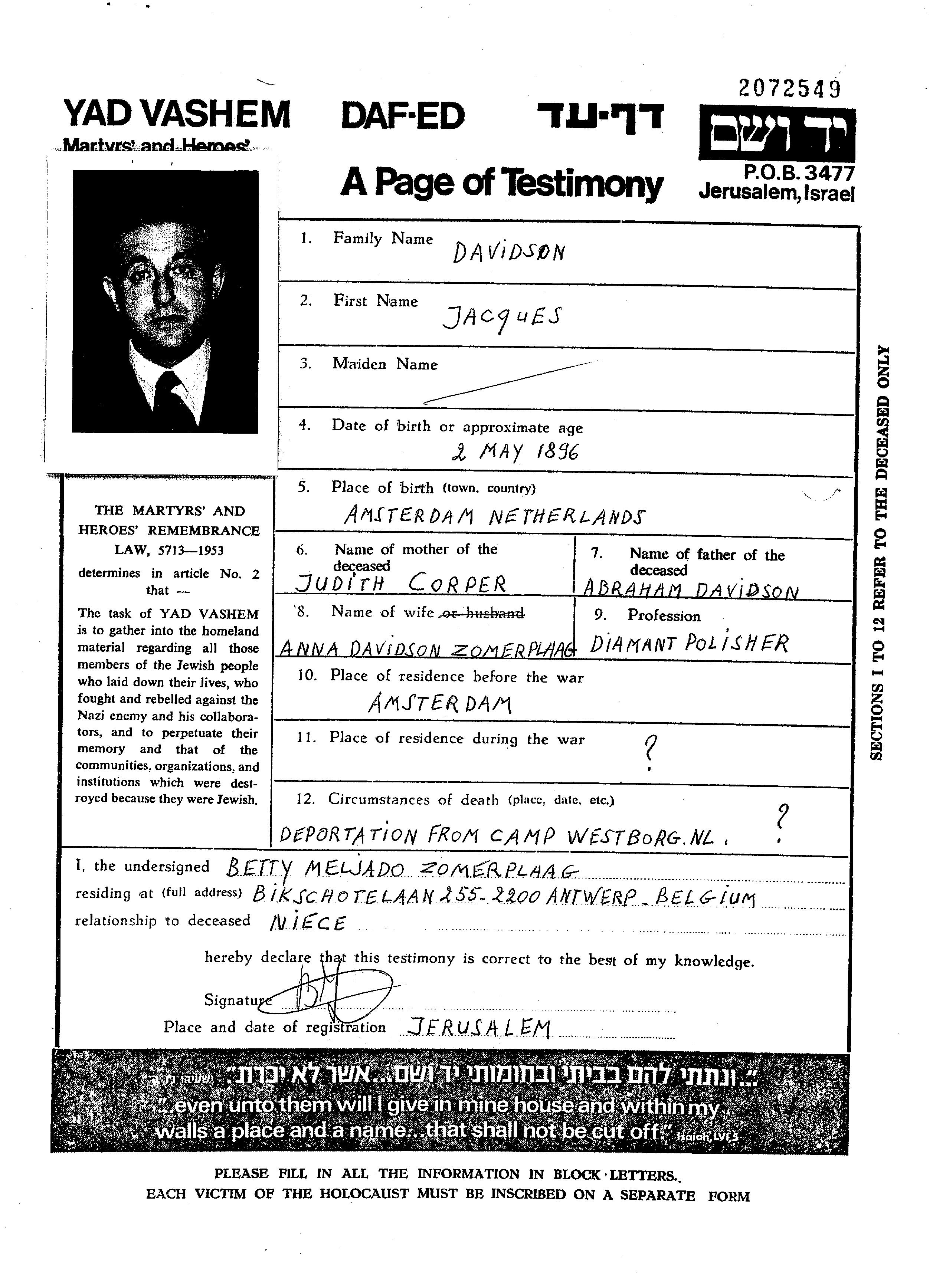 Jacques Davidson wurde im Jahr 1896 in Amsterdam, Niederlande geboren. Er war Diamantenhändler. Vor dem Zweiten Weltkrieg lebte er in Amsterdam, Niederlande.