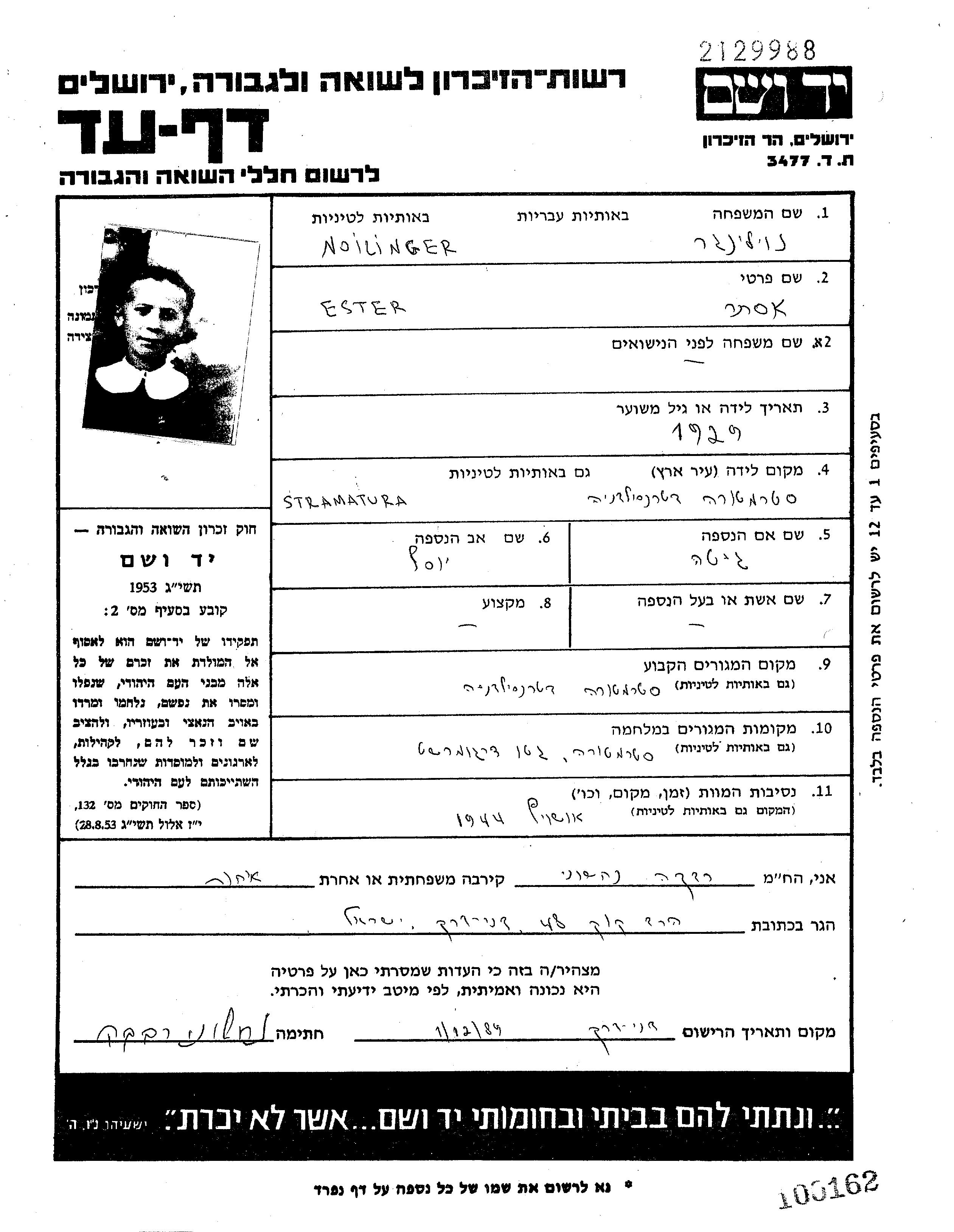 Ester Noilinger wurde im Jahr 1929 in Stramtura, Rumänien geboren. Vor dem Zweiten Weltkrieg lebte sie in Stramtura, Rumänien.