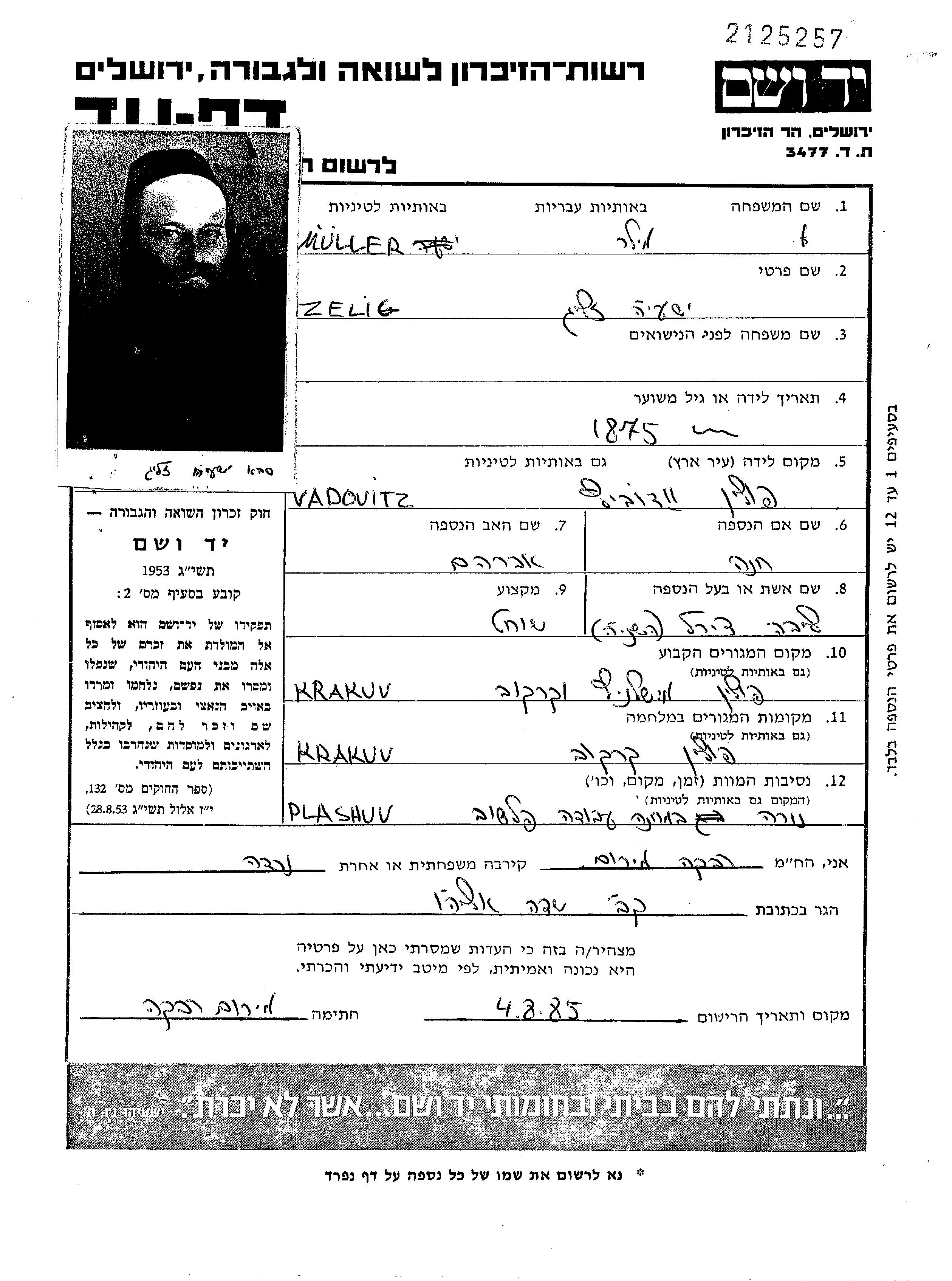 Yeshaiahu Zelig Müller wurde im Jahr 1875 in Wadowice, Polen geboren. Er war Schächter. Vor dem Zweiten Weltkrieg lebte er in Krakow, Polen.