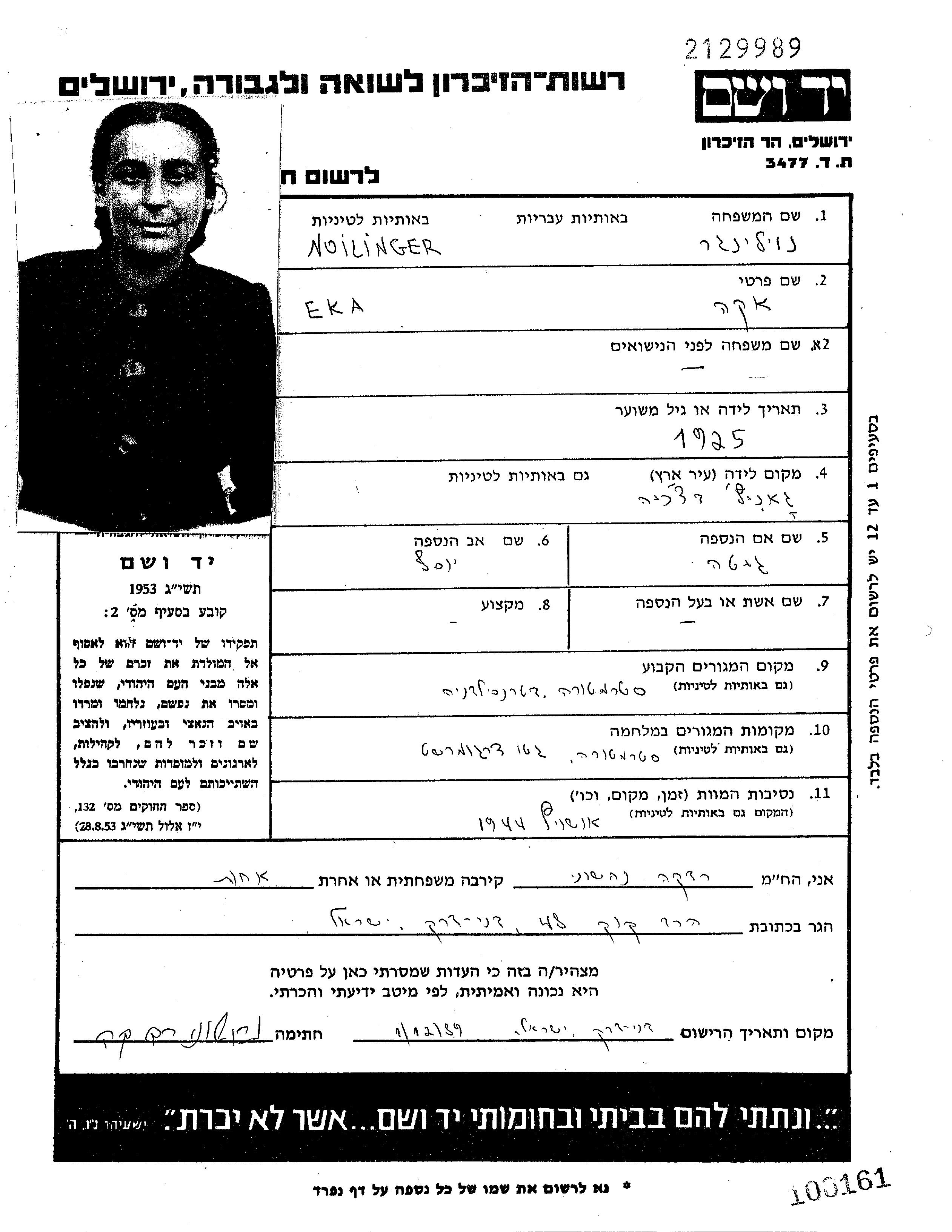 Eka Noilinger wurde im Jahr 1925 in Ganice, Tschechoslowakei geboren. Vor dem Zweiten Weltkrieg lebte sie in Stramtura, Rumänien.