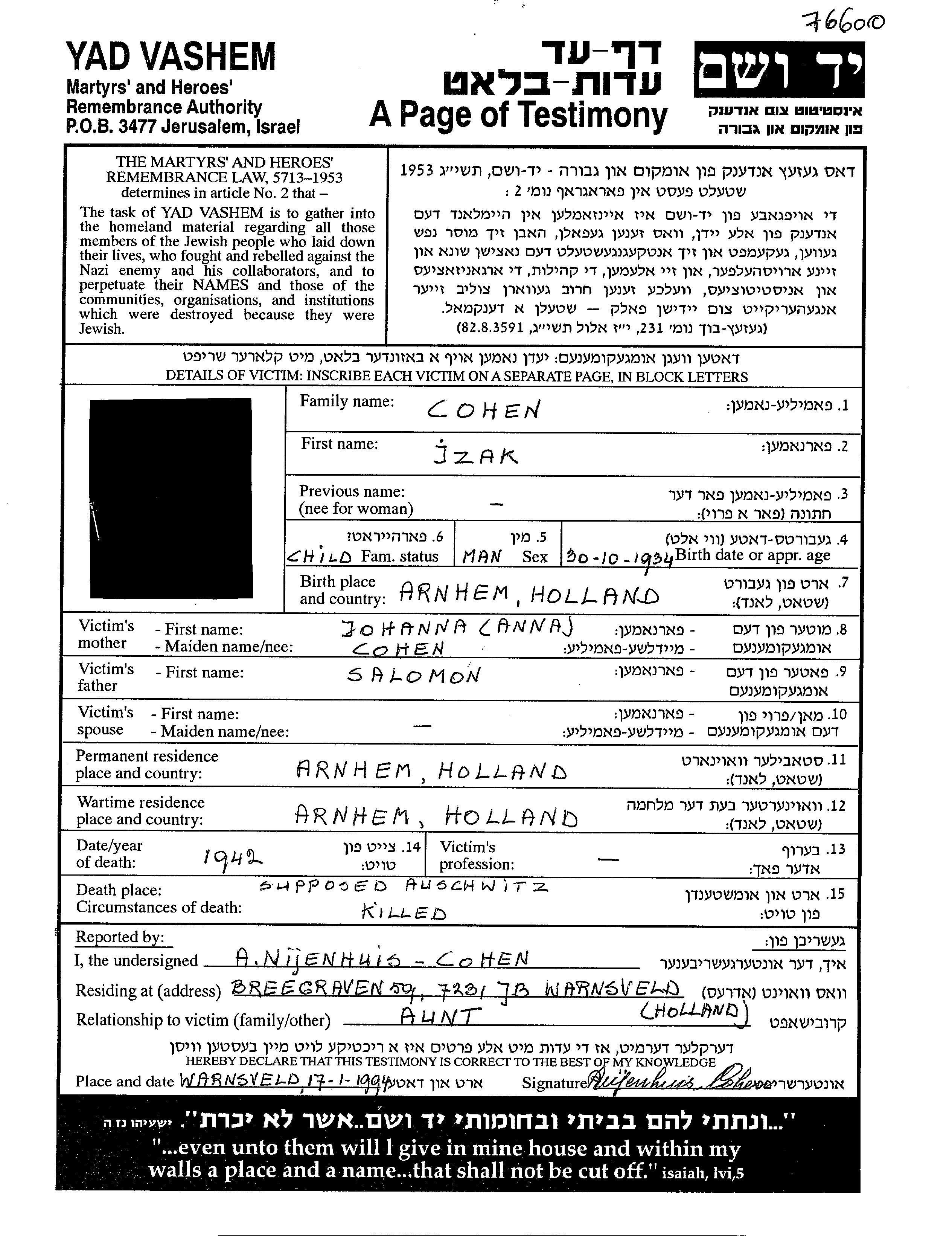 | Cohen | Izak | 1934 | Arnhem, Niederlande | Liste von ermordeten Juden aus Holland |