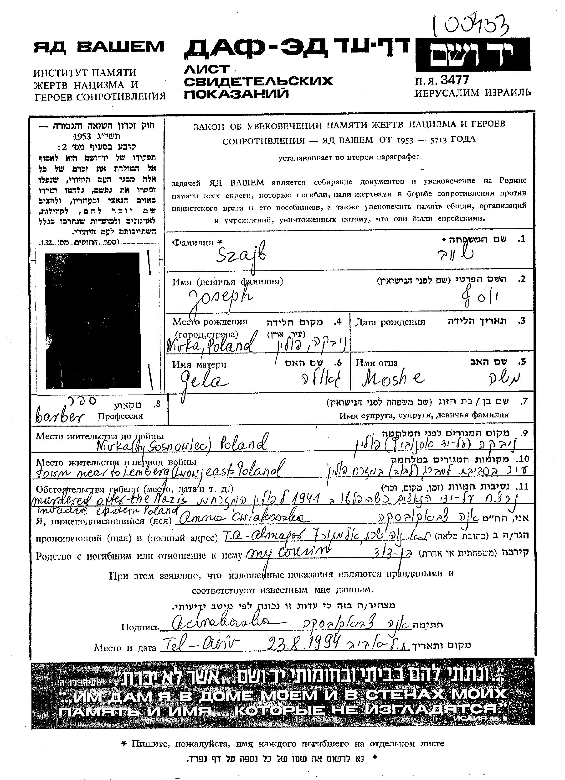 Joseph Szajb wurde in Niwka, Polen geboren. Er war Friseur/-in. Vor dem Zweiten Weltkrieg lebte er in Niwka, Polen.
