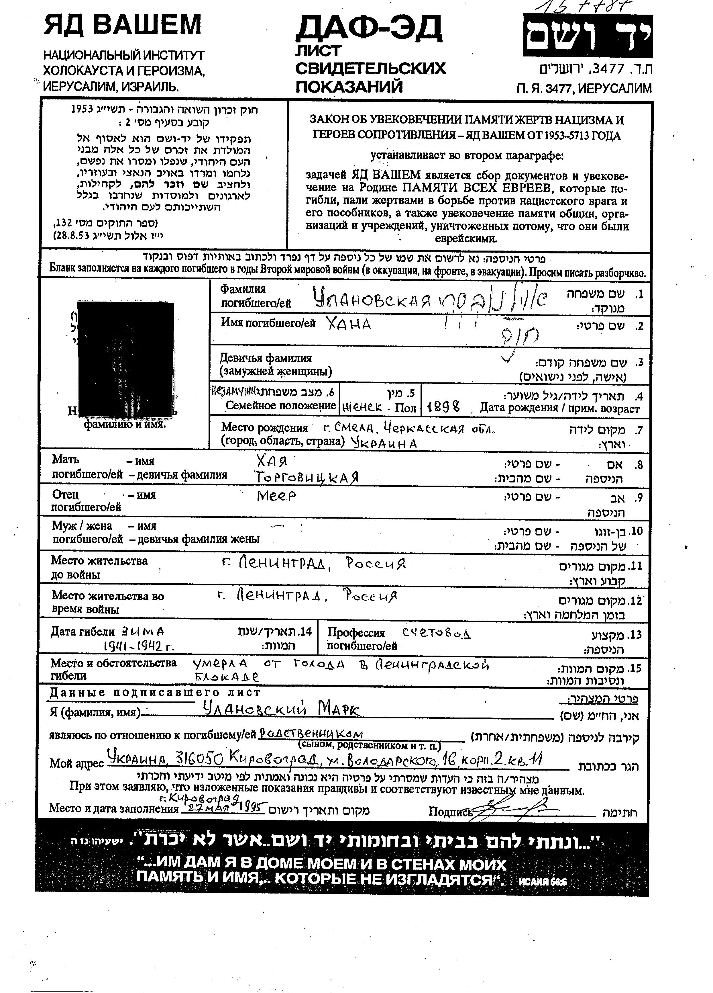 Khana Ulanovski wurde im Jahr 1898 in Smela, Ukraine (UdSSR) geboren. Sie war Buchhalter/-in. Vor dem Zweiten Weltkrieg lebte sie in Leningrad, Russland (UdSSR).