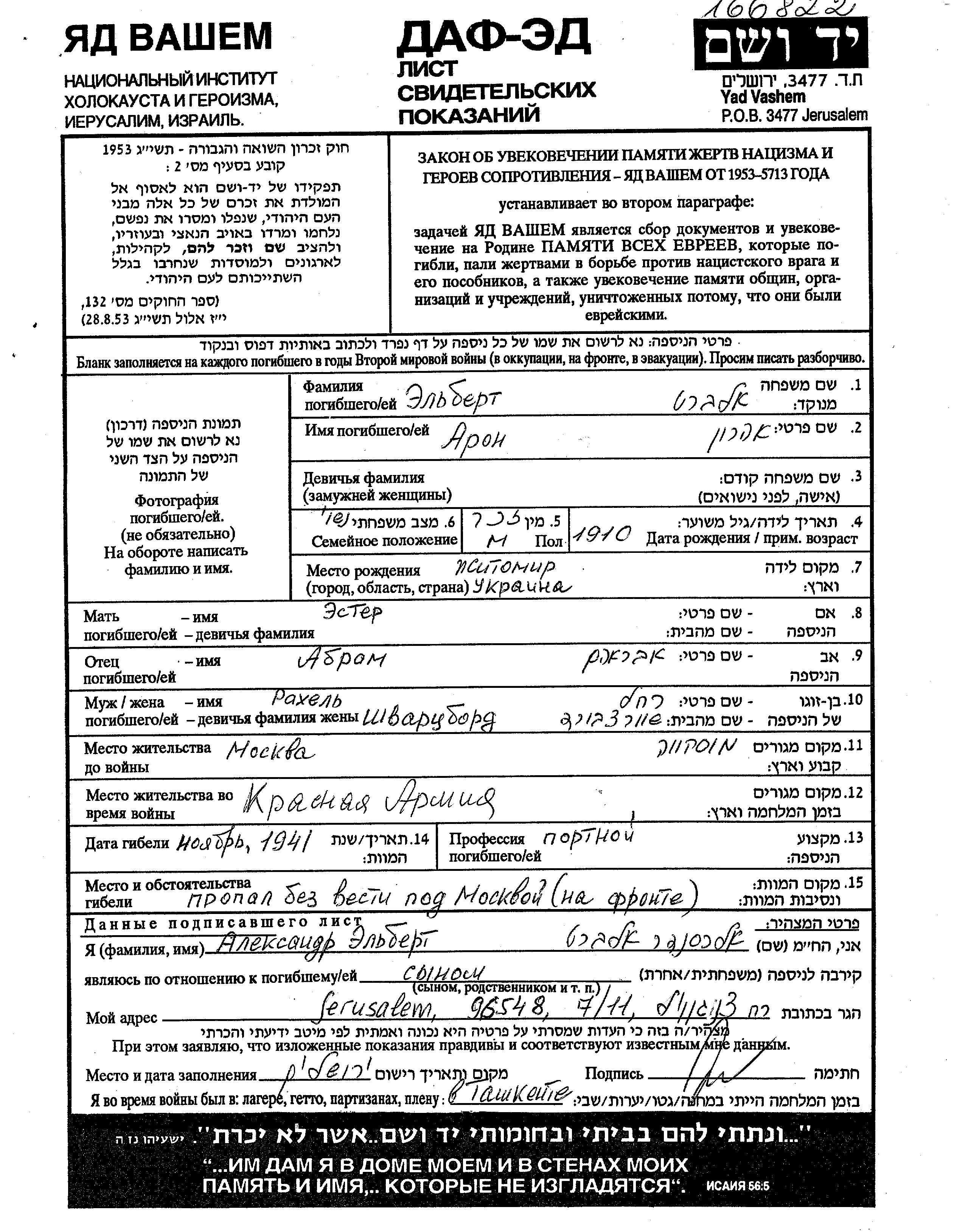 Aron Elbert wurde im Jahr 1910 in Zhitomir, Ukraine (UdSSR) geboren. Er war Schneider. Vor dem Zweiten Weltkrieg lebte er in Moskva, Russland (UdSSR).