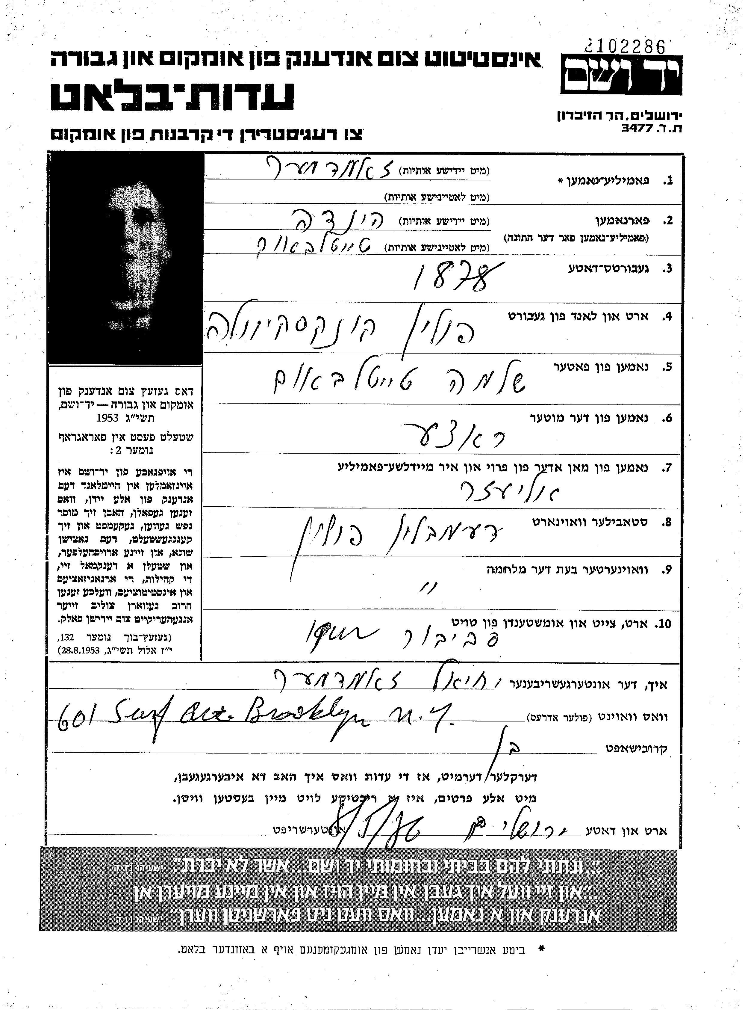 Hinda Zamdmer, geb. Taitelbaum wurde im Jahr 1878 in Konskowola, Polen geboren. Vor dem Zweiten Weltkrieg lebte sie in Demblin, Polen.
