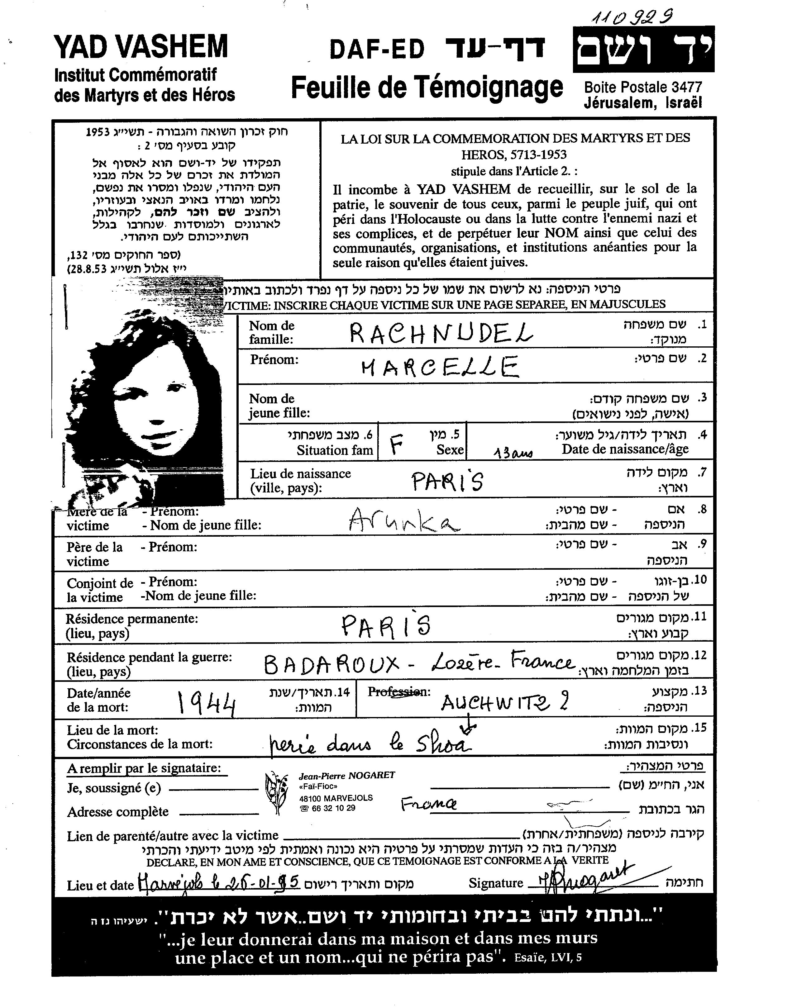 Marcelle Marsel Rachnudel wurde im Jahr 1931 in Paris, Frankreich geboren. Vor dem Zweiten Weltkrieg lebte sie in Paris, Frankreich.