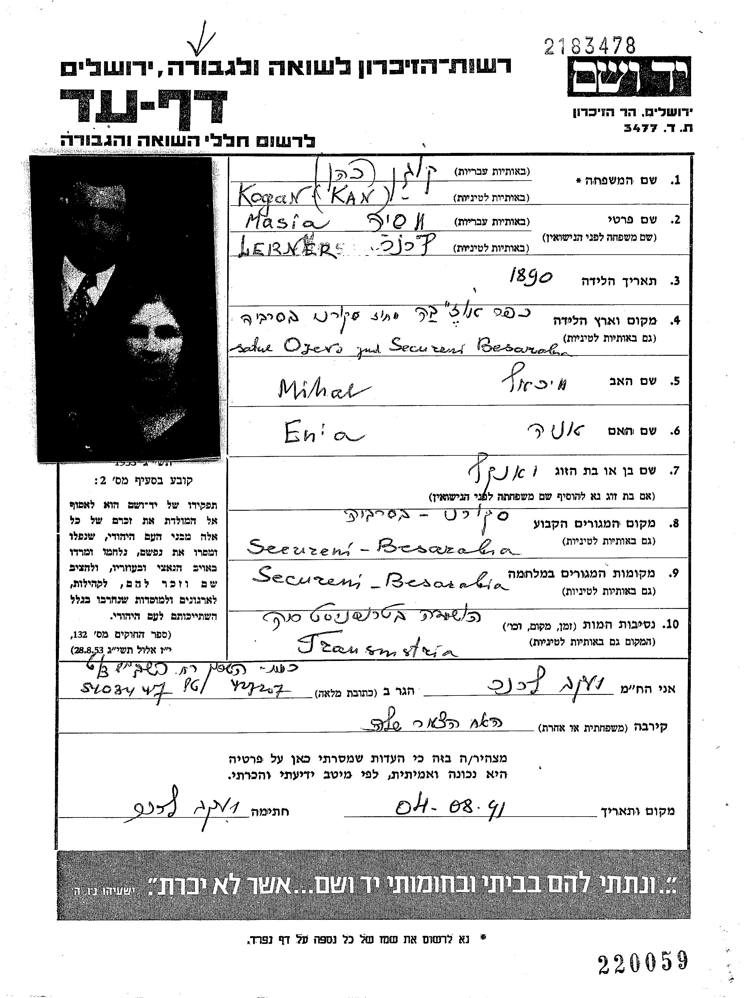Masia Kan Kogan Kohen, geb. Lerner wurde im Jahr 1890 in Ojeva, Rumänien geboren. Vor dem Zweiten Weltkrieg lebte sie in Secureni, Rumänien.