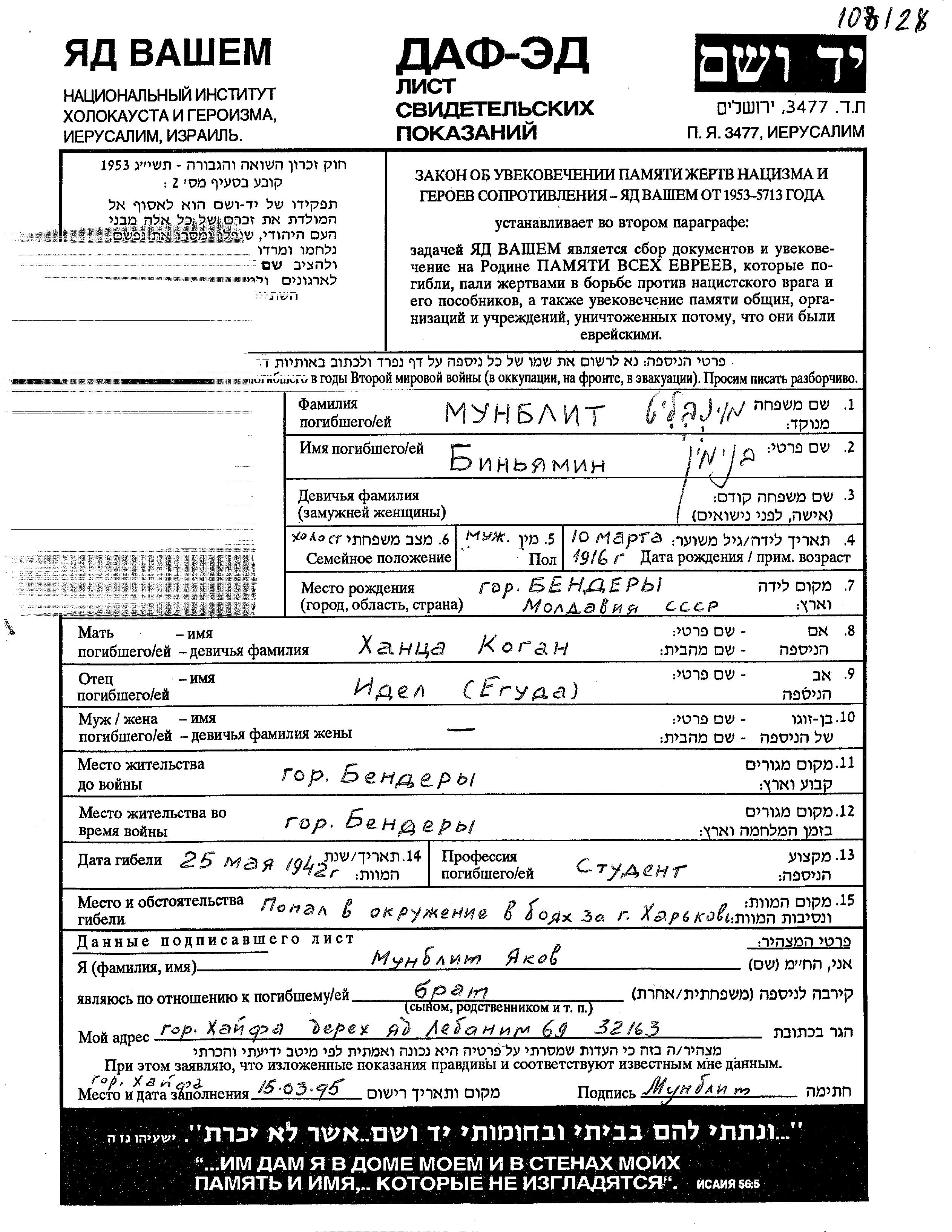 Binyamin Munblit wurde im Jahr 1916 in Tighina, Rumänien geboren. Er war Student. Vor dem Zweiten Weltkrieg lebte er in Tighina, Rumänien.