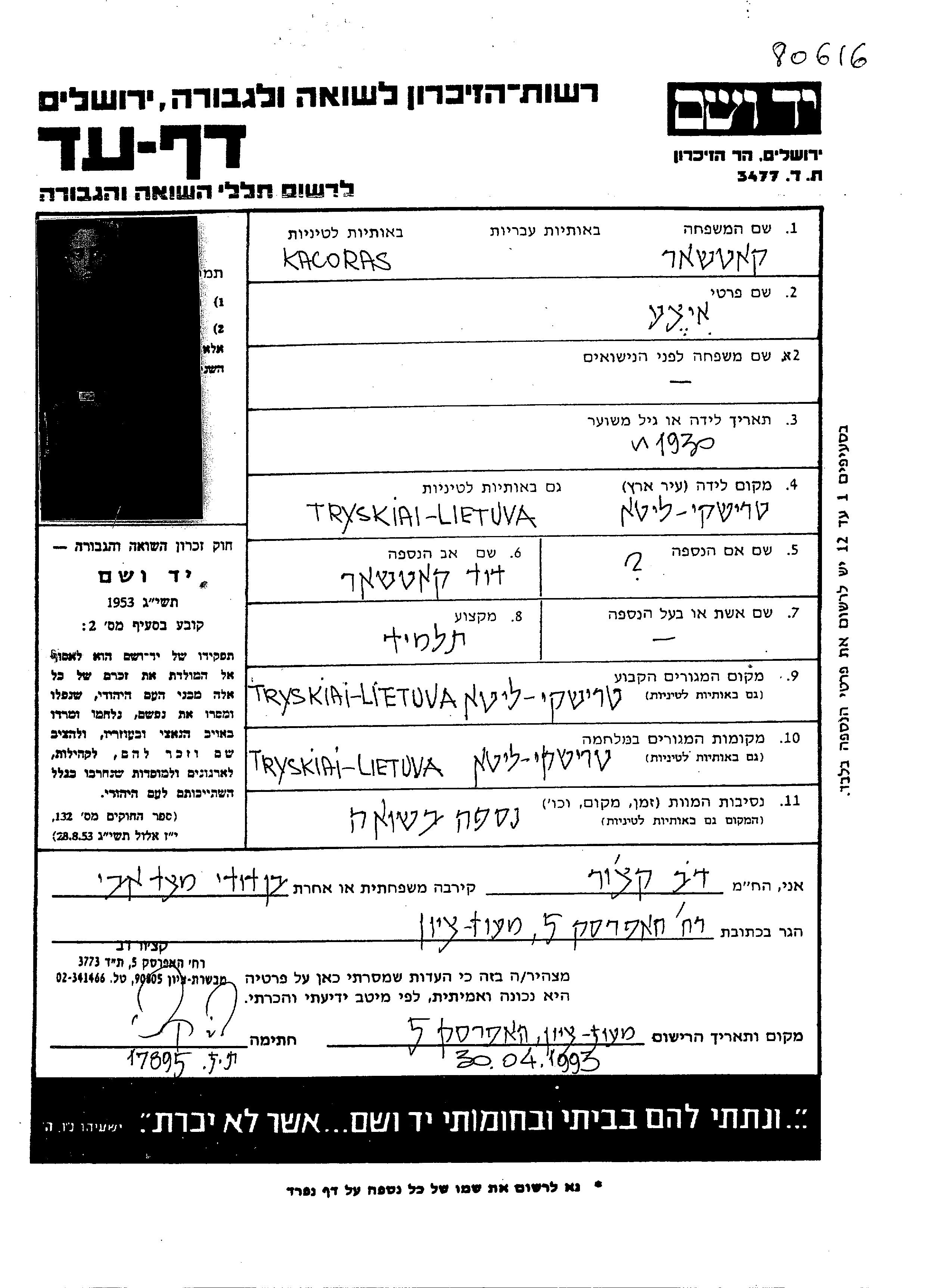 Itze Kacoras wurde im Jahr 1930 in Tryskiai, Litauen geboren. Er war Schüler/-in. Vor dem Zweiten Weltkrieg lebte er in Tryskiai, Litauen.