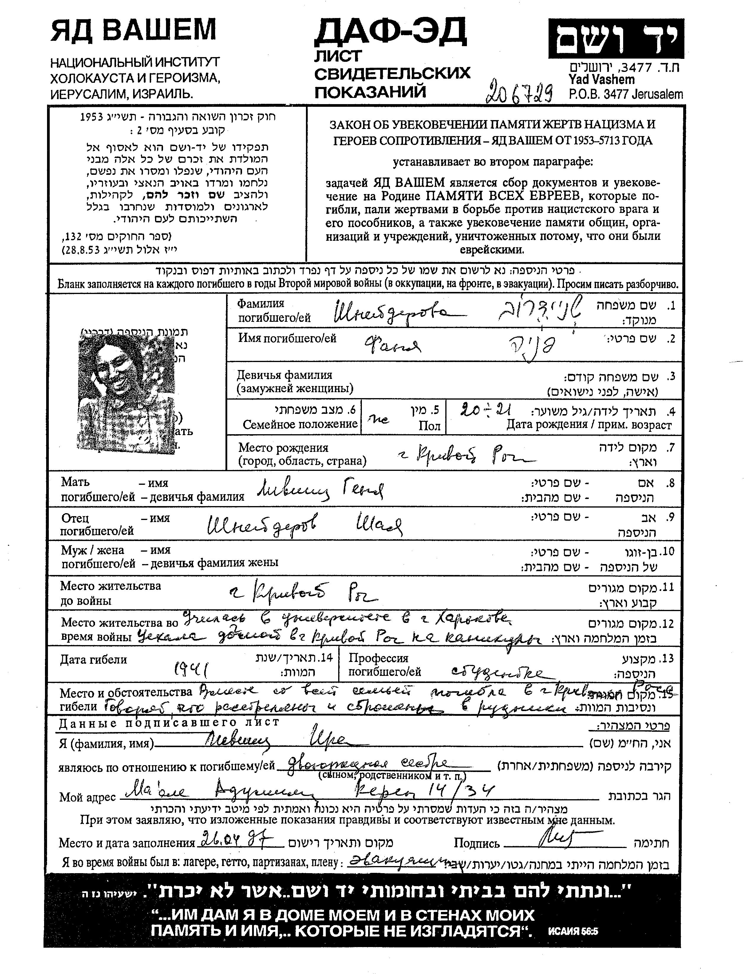 | Shneiderov | Fanya | 1920 | Kharkov, Ukraine (UdSSR) | Gedenkblatt |