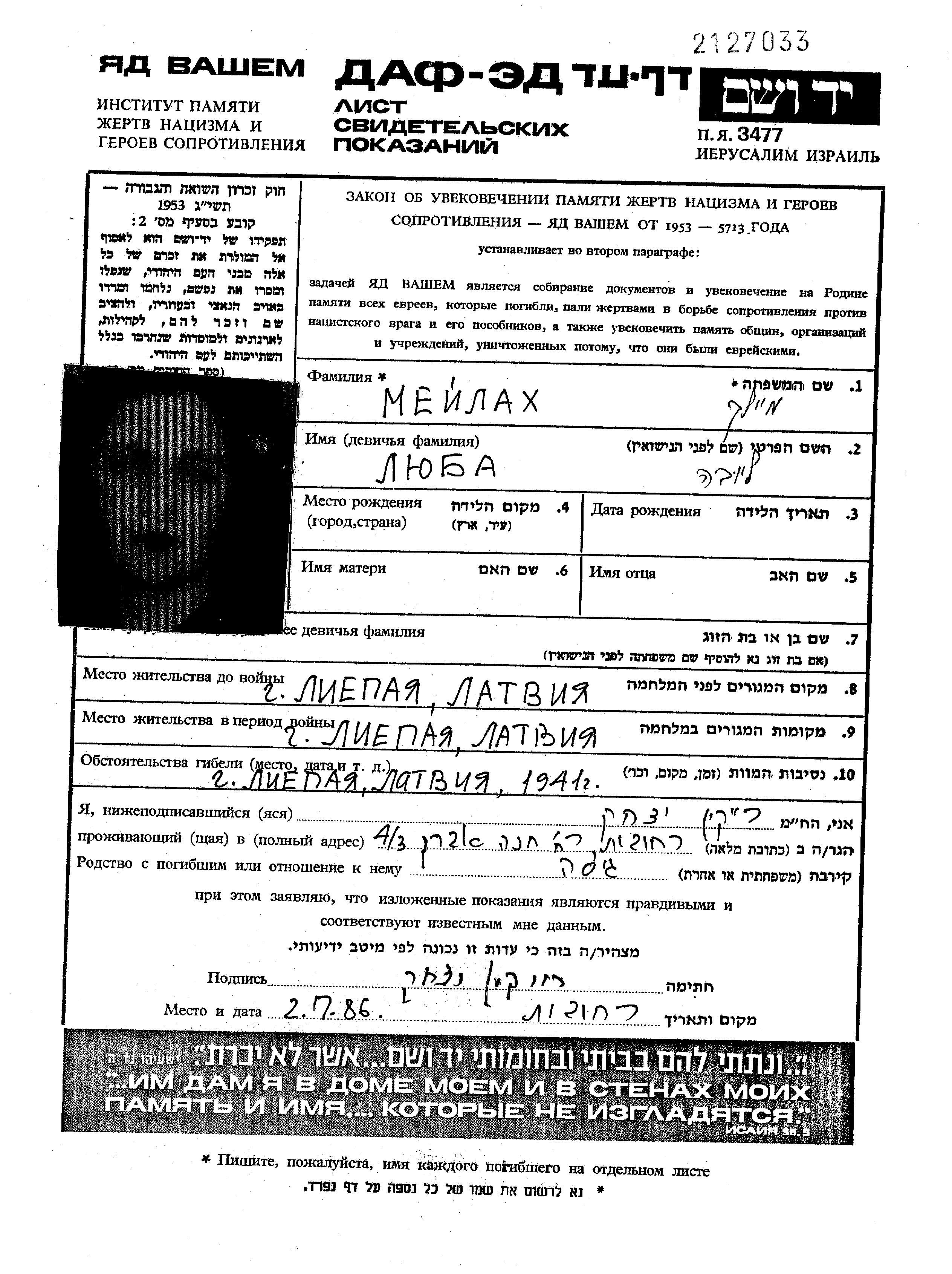 Meilakh Lyuba Liepaja, Lettland Gedenkblatt