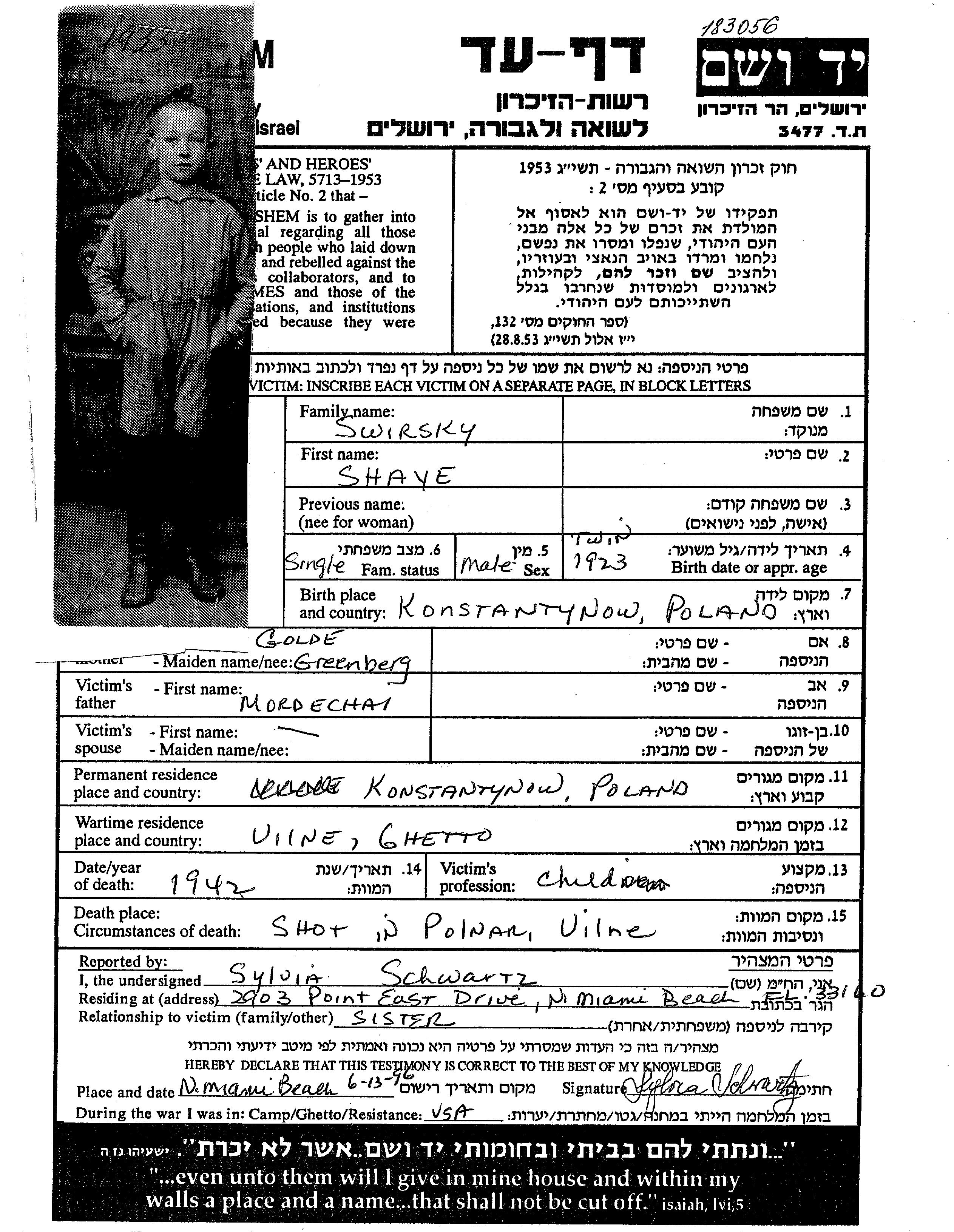 Shaye Swirsky wurde im Jahr 1923 in Konstantynow, Polen geboren. Er war Schüler/-in. Vor dem Zweiten Weltkrieg lebte er in Konstantynow, Polen.