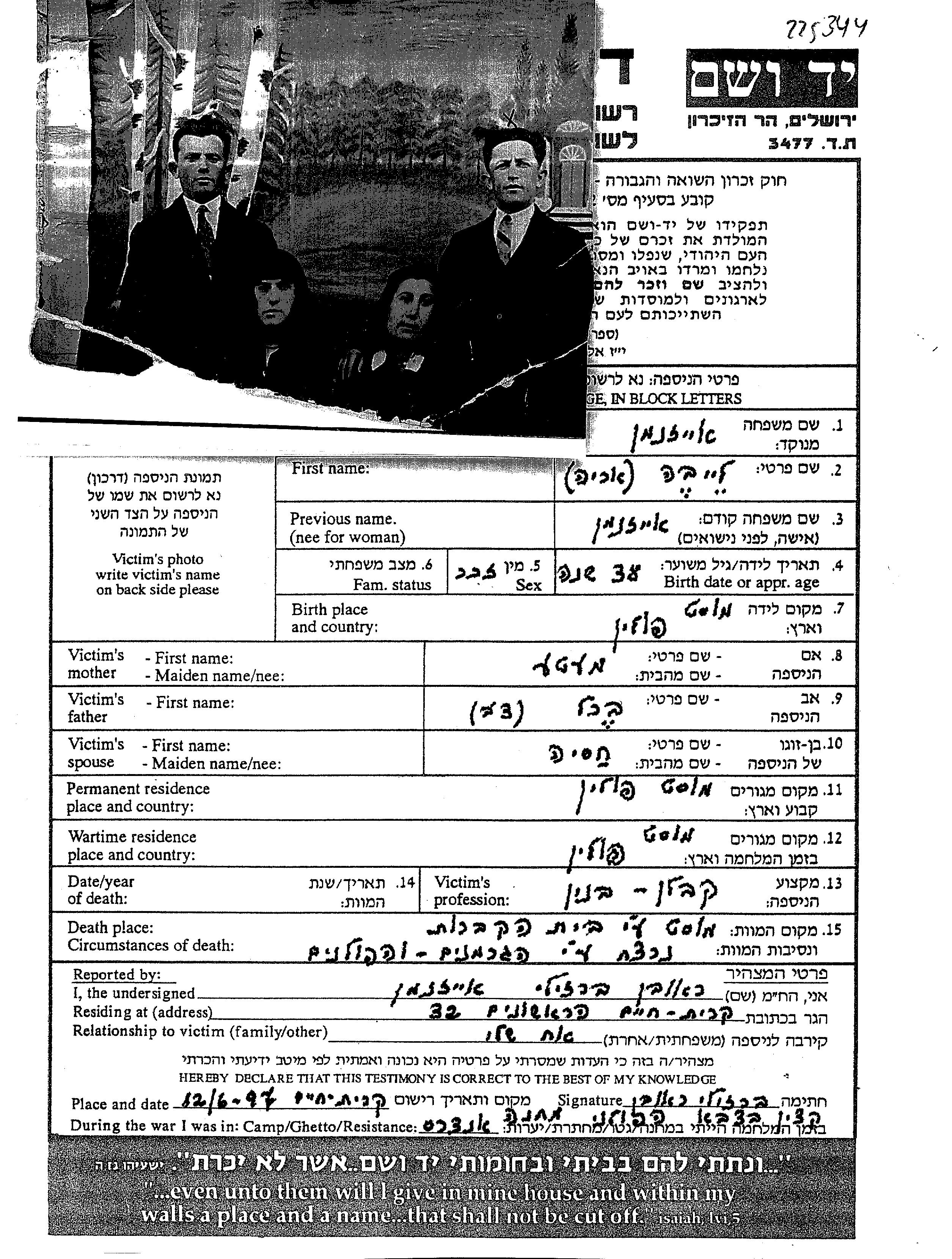 Leiba Arie Aizenman wurde in Mosty, Polen geboren. Er war Unternehmer. Vor dem Zweiten Weltkrieg lebte er in Mosty, Polen.